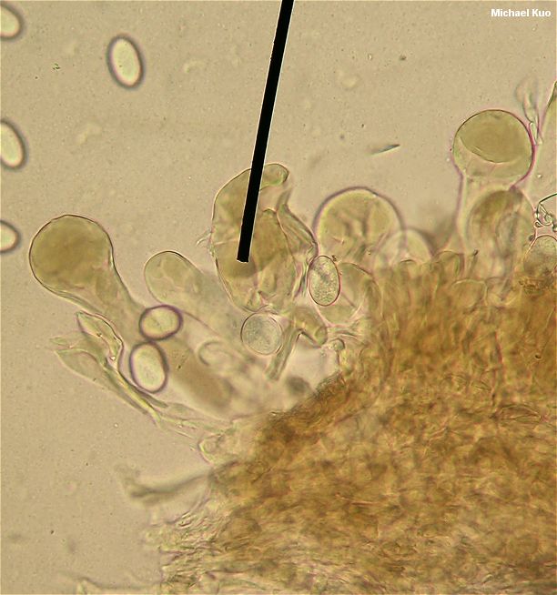 Morchella capitata [ Ascomycetes > Pezizales > Morchellaceae > Morchella . . . ] by Michael Kuo Morchella capitata is one of three frustratingly similar morel species that appear in western North America's conifer burn sites (a fourth burn-site species, Morchella tomentosa, has densely fuzzy surfaces and is easily separated). Unlike the apparently inseparable Morchella sextelata and Morchella septimelata, however, Morchella capitata appears to have some physical features separating it: its stem is often chambered and layered internally, and the elements on its sterile ridges, under the microscope, are "capitate," which means they have roundish swollen ends. That's my theory, anyway, based on examination of seven collections, six of which were fresh. Among those collections, the chambered stems and capitate ridge elements were the only features I found that consistently applied to Morchella capitata and not consistently to other species. Although just about any morel can develop a thickened, chambered stem if it remains unpicked in favorable growing conditions, the stems of the Morchella capitata specimens I studied were all chambered, even in young specimens--and while sterile ridge elements are occasionally capitate on several other morel species, the sterile ridges of the Morchella capitata collections I examined were consistently and prominently so. Two of the collections I looked at were olive green, and would have qualified as what commercial morel pickers sometimes call "pickles" or "greenies"--but the other collections were not green, and specimens of Morchella sextelata and Morchella septimelata are frequently green, too; color appears not to be a reliable way to separate the burn-site morels of our continent. Description: Ecology: Possibly saprobic and mycorrhizal at different points in its life cycle; appearing in lightly burned spruce and fir forests in Oregon, and possibly in conifer burn sites throughout western North America, in the spring or summer following the fire. Cap: 4-8 cm tall and 2.5-8 cm wide; conical or nearly so, but occasionally egg-shaped or nearly round; pitted and ridged, with the pits primarily arranged vertically by maturity; when young with bald or finely velvety, flattened, olive green or brownish ridges and pits; when mature with flattened to sharpened or eroded, dark brown to black ridges and brownish to tan pits; attached to the stem with a small groove (1-7 mm deep); hollow. Stem: 2.5-5 cm high and 2-5 cm wide; equal, or sometimes becoming somewhat swollen at the base; whitish to pale brownish; bald or finely mealy with granules; chambered and layered inside (often densely so), even when young. Microscopic Features: Spores 18-25 x 12-17(-19) µ; smooth; elliptical; without oil droplets; contents homogeneous. Asci 8-spored. Paraphyses cylindric with clavate, subfusiform, or merely rounded apices; septate; hyaline to brownish in KOH. Elements on sterile ridges 75-200 x 10-35 µ; septate; brown in KOH; terminal cell usually subcapitate, capitate, or dramatically capitate (strongly swollen and subglobose) but occasionally clavate or merely cylindrical with a rounded apex. REFERENCES: M. Kuo, & M. C. Carter in Kuo et al., 2012. (O'Donnell et al., 2011; Kuo et al., 2012.) SPECIMENS EXAMINED: Herb. F. 08070401, 08070402, 08070405, 08070406 (holotype), 08070407, 08070408. Herb. OSC 139278. This site contains no information about the edibility or toxicity of mushrooms. |
