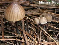 Mycena leptocephala [ Basidiomycetes > Agaricales > Tricholomataceae > Mycena . . . ] by Michael Kuo Gray to brown Mycena species are not the easiest mushrooms to identify, but Mycena leptocephala has several distinguishing features, including a strong bleach-like odor; terrestrial, gregarious habitat under conifers; and, under a microscope, spindle-shaped cheilocystidia that are not adorned with abundant rod-like projections. Mycena alcalina is very similar, even in microscopic features, but it grows in clusters on conifer stumps and logs, and tends to be a little stockier. Many small mushrooms have distinctive odors, best detected by crushing one of the caps between your finger and thumb, then taking a whiff. Aside from the smell of bleach, other distinctive odors include a mealy smell (reminiscent of watermelon rind or cucumbers), an odor of radishes, and an odor of garlic or onions. Often a distinctive odor is strong enough that a subsequent taste test is not needed. However, people's noses work differently and I, for example, have trouble detecting "radish-like" as an odor, though the taste registers clear as a bell with my taste buds. Description: Ecology: Saprobic on the debris of conifers; growing scattered to gregariously on the ground; spring and fall (or over winter in warmer climates); widely distributed in North America. Cap: 1-4 cm; conical when young, becoming broadly conical, convex, or broadly bell-shaped; moist; with a whitish bloom when young, but soon bald; black or dark grayish brown when young, fading somewhat to grayish brown or gray with age; the margin faintly lined at first, later becoming more strongly lined. Gills: Attached to the stem by a tooth; nearly distant; whitish or pale grayish. Stem: 3-7 cm long; 1-3 mm thick; fragile; equal; hollow; with a whitish bloom at first, but soon bald; black to dark brown at first, becoming grayish or brownish; basal mycelium whitish. Flesh: Insubstantial; pallid or grayish. Odor and Taste: Odor strongly bleachlike; taste acidic and unpleasant. Spore Print: White. Microscopic Features: Spores 7-10 x 4-6 µ; weakly to moderately amyloid; elliptical; smooth. Basidia usually 4-spored. Cheilocystidia abundant; 30-45 µ long; fusoid-ventricose, subcylindric, or clavate, without digitate projections. Pleurocystidia scattered or sometimes absent; similar to cheilocystidia. Pileipellis a cutis; uppermost elements digitate with short rod-like projections. REFERENCES: (Persoon, 1800) Gillet, 1876. (Saccardo, 1887; Kauffman, 1918; Smith, 1947; Breitenbach & Kränzlin, 1991; Hansen & Knudsen, 1992; McNeil, 2006.) Herb. Kuo 11220401, 04180701. This site contains no information about the edibility or toxicity of mushrooms. |