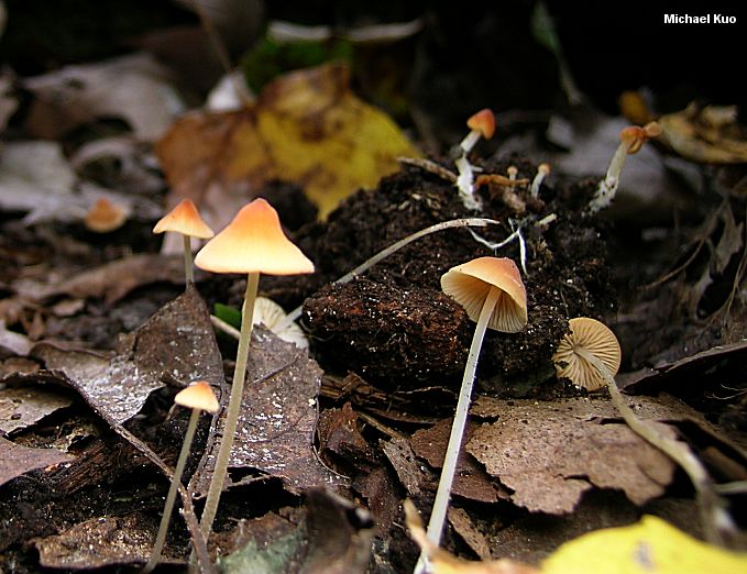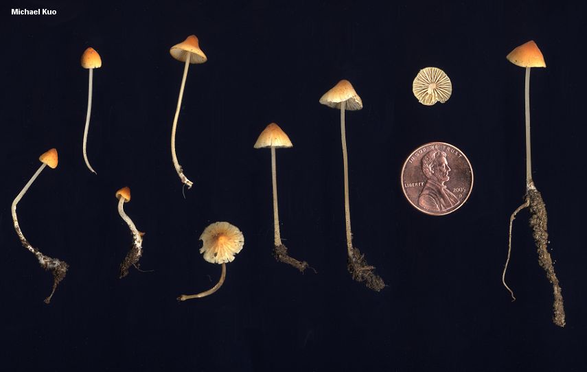 Mycena leptophylla [ Basidiomycetes > Agaricales > Tricholomataceae > Mycena . . . ] by Michael Kuo Closely related to the better known Mycena adonis (and often conflated with it in field guide treatments), this tiny, beautiful mushroom grows on the ground in hardwood forests, usually in the vicinity of rotting wood. It features a bell-shaped to conical, yellow to dull orange cap, and a stem that often forms a tap root that burrows into the substrate. Under the microscope it has fairly inconspicuous, fusoid-ventricose cheilocystidia and nearly round spores. Mycena roseipallens, which also appears under hardwoods, is nearly identical but has more red in its cap color and features ellipsoid spores. Mycena adonis grows primarily on the debris of conifers and has a scarlet cap, along with different microscopic features. Description: Ecology: Saprobic on terrestrial forest debris in hardwood forests (and occasionally reported in conifer forests); usually growing gregariously but sometimes found growing scattered or even solitary; fall; apparently fairly widely distributed in eastern North America. Cap: Up to 2.5 cm across; conical to broadly conical or bell-shaped, often with a central nipple; moist when fresh; bald; dull orange, becoming orangish to yellowish over the center and whitish toward the margin; the margin lined. Gills: Attached to the stem by a tooth; close or nearly distant; whitish or pale pinkish to pale orangish. Stem: 3-7 cm long (above ground); 1-2 mm thick; fragile; equal; hollow; very finely silky, or bald; whitish to silvery grayish or very pale yellowish; basal mycelium hairy and white; often forming a tap root up to about 5 cm long. Flesh: Insubstantial; pallid or grayish. Odor and Taste: Odor not distinctive or very faintly mealy; taste not distinctive. Chemical Reactions: KOH negative on cap surface. Spore Print: White. Microscopic Features: Spores 6.5-8 x 4.5-7 µ; inamyloid; mostly ovoid to subglobose, but occasionally broadly ellipsoid or nearly amygdaliform; smooth. Basidia 2- or 4-spored. Cheilocystidia up to about 40 x 10 µ; fusoid-ventricose; only rarely branched. Pleurocystidia absent or very rare. Pileipellis a cutis, with the uppermost elements sparsely diverticulate. REFERENCES: Peck, 1872. (Saccardo, 1887; Smith, 1947; Moser, 1978; Hansen & Knudsen, 1992; McNeil, 2006.) Herb. Kuo 09280601. This site contains no information about the edibility or toxicity of mushrooms. |