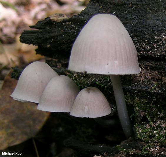 Mycena niveipes [ Basidiomycetes > Agaricales > Tricholomataceae > Mycena . . . ] by Michael Kuo Among the species of Mycena with a bleach-like odor (crush one of the caps between your finger and thumb), Mycena niveipes can be recognized by the fact that it grows on the deadwood of hardwoods and features a pale grayish to brownish cap that soon fades to nearly white, along with a silvery stem that is often finely grooved and covered with tiny white fibers. Under the microscope, it features very long, fusiform cystidia. Mycena alcalina is similar and also grows on wood, but has a darker cap and somewhat shorter cystidia. Description: Ecology: Saprobic on the well decayed, mossy deadwood (stumps and logs) of hardwoods (especially the wood of oaks, ashes, and maples); growing gregariously or in loose clusters; spring through fall; widely distributed in North America from the Great Plains eastward. Cap: 1.5-7 cm; broadly conical, broadly bell-shaped, convex, or planoconvex; moist when fresh; bald; pale grayish to pale brownish when young, fading to whitish, sometimes with a slightly darker center; the margin faintly lined at first, later becoming more strongly lined and often splitting in age. Gills: Attached to the stem by a tooth; close or nearly distant; whitish or pale grayish (occasionally faintly pinkish). Stem: 4-10 cm long; 2-7 mm thick; fragile; equal; hollow; adorned with tiny whitish fibers at first, but often bald by maturity; silvery grayish at first, becoming whitish; sometimes discoloring a little brownish in the basal half with age or on handling; basal mycelium white. Flesh: Insubstantial; pallid or grayish. Odor and Taste: Odor usually strongly bleachlike but sometimes only weakly so, or not distinctive (especially in older specimens); taste acidic and unpleasant. Spore Print: White. Chemical Reactions: KOH negative on cap surface. Microscopic Features: Spores 8-11 x 5-7 µ; weakly to moderately amyloid; elliptical; smooth. Basidia 2- or 4-spored. Cheilocystidia abundant; up to 90 x 15 µ; fusoid-ventricose, without digitate projections. Pleurocystidia similar to cheilocystidia. Pileipellis a cutis. REFERENCES: Murrill, 1916. (Saccardo, 1925; Smith, 1947; Smith, Smith & Weber, 1979; Hansen & Knudsen, 1992; McNeil, 2006.) Herb. Kuo 05149502, 06019511, 10090301, 08290502, 09170602. This site contains no information about the edibility or toxicity of mushrooms. |