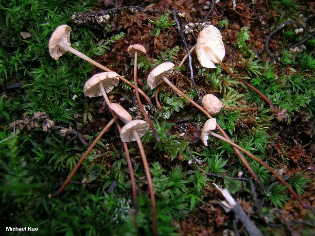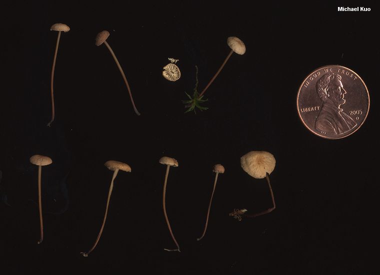 Mycetinis scorodonius [ Basidiomycetes > Agaricales > Marasmiaceae > Mycetinis . . . ] by Michael Kuo Lots of mushrooms have peculiar and distinctive odors but this little guy, along with a couple of his close relatives, reeks of garlic and onions--so much so, in fact, that you can sometimes smell the tiny little things in the woods before you see them. Usually, odors in tiny mushrooms are faint until you crush a cap between your thumb and finger, but this routine isn't needed with Mycetinis scorodonius. Either that, or the few collections I have made were particularly pungent. The "Marasmius scorodonius" in your field guide is, indeed, the same little stinker of a mushroom as the one illustrated here. A study from 2005 (Wilson & Desjardin) determined that several of our traditional generic concepts for marasmioid and collybioid mushrooms were not supported by DNA; the garlicky species of Marasmius, the authors determined, belonged with several other species in Mycetinis. A 1998 study (Gordon & Petersen) determined the North American version of Mycetinis scorodonius was able to mate with the European version; thus a single biological species is found on either side of the Atlantic. Other garlic-reeking species in North America include Mycetinis copelandii and Mycentinis olidus, both of which differ from Mycetinis scorodonius in having hairy to velvety stems and spores that are longer than 10 µ; the former is found in western North America and the latter is found east of the Rocky Mountains. Description: Ecology: Saprobic; primarily found on the fallen needles of conifers, but occasionally found on the mossy bark of living hardwoods or conifers, or arising from grass stems or twigs (of hardwoods or conifers) in woodland settings; growing scattered or gregariously; summer and fall; widely distributed east of the Great Plains; absent or very rare in the west. Cap: 2-30 mm across; convex, becoming broadly convex or broadly bell-shaped but often developing a central depression and/or bump; dry; bald; becoming slightly wrinkled; medium brown when very young but soon fading to buff or pale tan, with or without a slightly darker center. Gills: Narrowly attached to the stem, or rarely attached to a tiny "collar" that circles the stem; whitish; close or nearly distant. Stem: Up to 60 mm long; 0.5-3 mm thick; equal; dry; shiny; bald, or with a few tiny hairs near the base; whitish to pale tan, becoming reddish to dark reddish brown by degrees from the base up. Flesh: Thin; insubstantial. Odor and Taste: Strongly of garlic or onion. Spore Print: White. Microscopic Features: Spores 6-10 x 3-5 µ; smooth; pip-shaped or ellipsoid; inamyloid. Pleurocystidia absent. Cheilocystidia to about 40 x 11 µ;; more or less clavate to cylindric, or irregular; often lobed; covered with knoblike or rodlike projections. Pileipellis a hymeniform layer of subglobose to clavate or irregular cells that sometimes develop fingerlike projections. REFERENCES: (Fries, 1815) A. W. Wilson & Desjardin, 2005. (Fries, 1821; Saccardo, 1887; Kauffman, 1918; Gilliam, 1975; Smith, Smith & Weber, 1979; Desjardin, 1987; Doyle & Sundberg, 1989; Breitenbach & Krânzlin, 1991; Phillips, 1991/2005; Lincoff, 1992; Gordon & Petersen, 1998; McNeil, 2006; Miller & Miller, 2006.) Herb. Kuo 07030805. This site contains no information about the edibility or toxicity of mushrooms. |