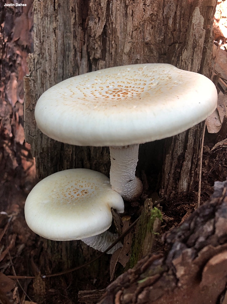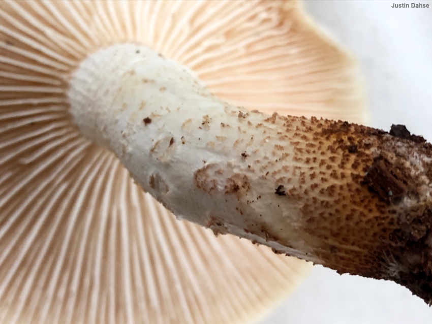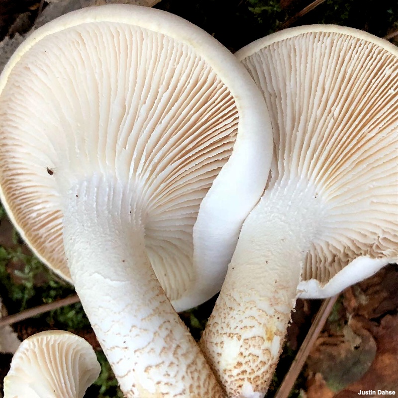 [ Basidiomycota > Gloeophyllales > Gloeophyllaceae > Neolentinus . . . ] Neolentinus lepideus by Michael Kuo, 12 September 2025 Neolentinus lepideus is a variable mushroom, but it can be recognized by its habitat on the deadwood of conifers (including treated lumber), its saw-toothed gills, its very tough flesh, and the scales on its cap and stem. It also features a partial veil, but the veil is rarely observed, since it quickly disappears as the cap opens up. In western North America Neolentinus ponderosus is similar. It does not have a veil, but since the veil on Neolentinus lepideus is ephemeral, the best way to separate the two species is probably by habitat: Neolentinus ponderosus is more likely to appear in "natural" settings on the dead stumps of pines, while Neolentinus lepideus—in western North America, anyway—is more likely to appear on lumber (fence wood, railroad tracks, and so on). In eastern North America, however, Neolentinus lepideus appears on both natural wood and lumber. East of the Rocky Mountains Pleurotus dryinus is very similar in overall appearance, but is a soft-fleshed species with velvety surfaces that lack scales. Lentinus lepideus is a synonym. Thanks to Justin Dahse for collecting, documenting, and preserving Neolentinus lepideus for study; his collection is deposited in The Herbarium of Michael Kuo. Description: Ecology: Saprobic on well-decayed conifer stumps and conifer wood, including treated lumber; causing a brown rot; growing alone or in small groups; summer and fall, or year-round in warm climates; originally described from Germany (Schaeffer 1762); widely distributed in Europe and North America; also present in the Caribbean, Asia, and Oceania; reported from Africa. The illustrated and described collection is from Florida. Cap: 2–15 cm across; convex with a slightly inrolled margin, becoming broadly convex; dry; whitish with small, brown, appressed scales. Gills: Broadly attached to the stem or beginning to run down it; close; short-gills frequent; white; edges serrated. Stem: 2–10 cm long; 2–4 cm wide; more or less equal; dry; scaly, with white, recurved scales that become reddish brown or darker toward the base; with an ephemeral, easily-lost ring; whitish; very tough. Flesh: White; very tough; unchanging when sliced, or turning dull yellow in the stem. Odor and Taste: Odor fragrant, reminiscent of anise; taste not distinctive. Spore Print: White. Microscopic Features: Spores 8–11 (–14) x 3–4.5 µm; subcylindric; smooth; thin-walled; hyaline in KOH; inamyloid. Basidia 4-spored. Hymenial cystidia not found. Pileipellis a cutis of hyaline, smooth elements 2.5–7.5 µm wide. Hyphal system dimitic at maturity. Clamp connections conspicuous. REFERENCES: (E. M. Fries, 1815) S. A. Redhead & J. H. Ginns, 1985. (Atkinson, 1903; Kauffman, 1918; Smith, 1949; Smith, 1973; Smith, Smith & Weber, 1981; Pegler, 1983; Arora, 1986; Boekhout, 1990; Breitenbach & Kränzlin, 1991; Phillips, 1991/2005; Schalkwijk-Barendsen, 1991; Lincoff, 1992; Metzler & Metzler, 1992; Grand, 2004; McNeil, 2006; Miller & Miller, 2006; Kuo, 2007; Boccardo et al., 2008; Trudell & Ammirati, 2009; Buczacki et al., 2012; Woehrel & Light, 2017; Baroni, 2017; Elliott & Stephenson, 2018; Knudsen, 2018; Læssøe & Petersen, 2019; Kibby, 2020; MacKinnon & Luther, 2021; McKnight et al., 2021.) Herb. Kuo 10251801. This site contains no information about the edibility or toxicity of mushrooms. |