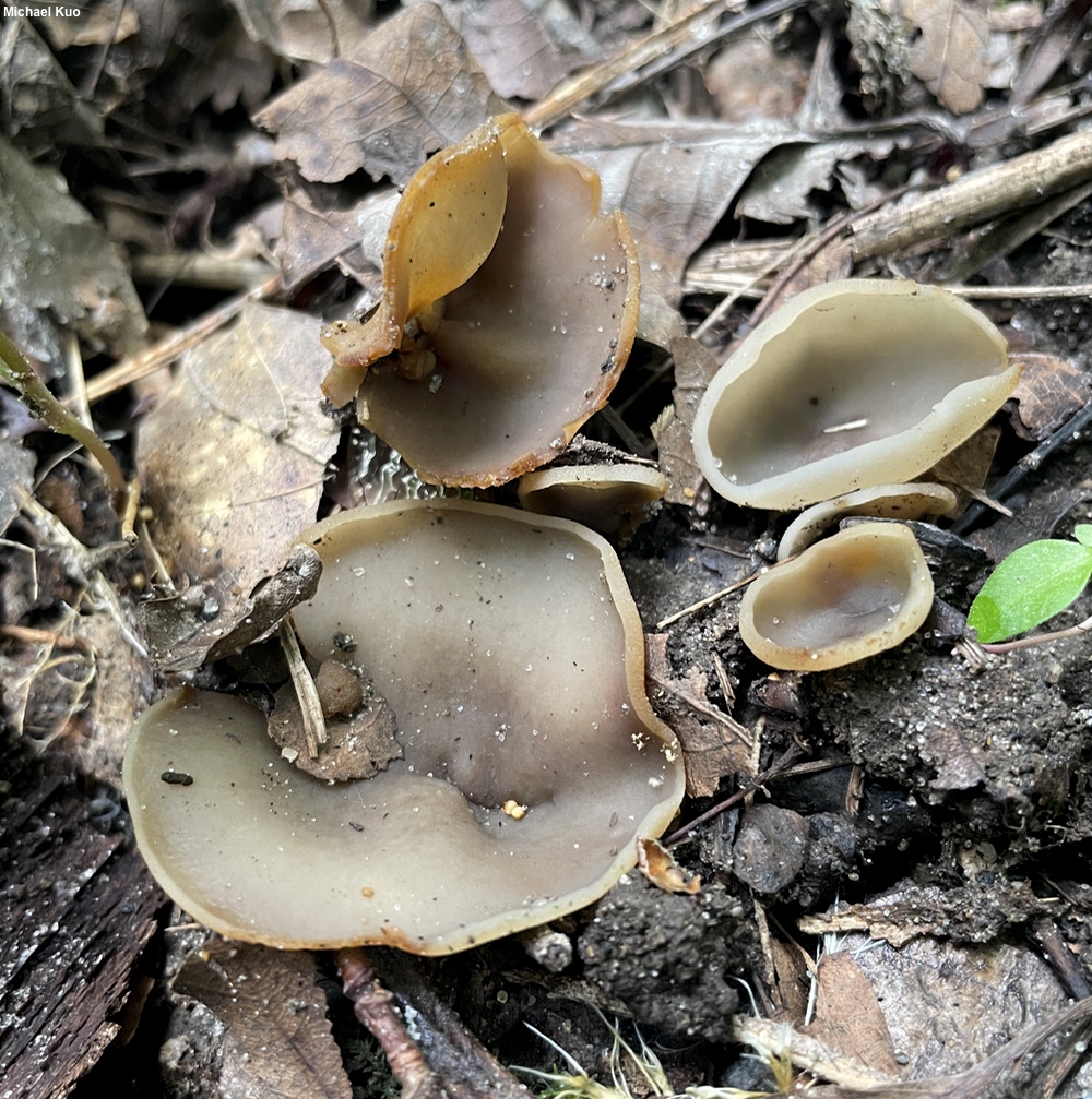 [ Ascomycota > Pezizales > Pezizaceae > Paragalactinia . . . ] Paragalactinia succosa agg. by Michael Kuo, 25 November 2024 Brownish cup fungi are often difficult to identify, but members of this species group distinguish themselves as soon as you handle them; their flesh contains a juice that stains your fingers and the cup's surfaces bright yellow. Under the microscopce Paragalactinia succosa and close relatives feature spores that are ornamented with fairly prominent, isolated warts. Paragalactinia michelii also has yellowing flesh, but its upper surface is purple to lavender (at least, when fresh), rather than brown. Peziza succosa was described in the 19th Century from Great Britain (Berkeley 1841), and recently combined into Paragalactinia (van Vooren 2020). In Europe, Paragalactinia succosa is putatively separable from the very similar Paragalactinia succosella on the basis of morphological features: succosella has smaller mature fruiting bodies (only up to 2 cm across) and slightly smaller spores that are primarily uniguttulate (containing one drop) during development, rather than biguttulate (Læssøe & Petersen 2019, van Vooren et al. 2022). Two other European species in the group can be separated on spore morphology: Paragalactinia hypoleuca has elongated-ellipsoid spores, and Paragalactinia infuscata has spores with less prominent ornamentation. However, my North American collections do not adapt well to these European concepts. None of my specimens appear to agree with hypoleuca or infuscata, but they combine succosa and succosella features willy nilly. Tiny mature cups with larger, biguttulate spores, large cups with smaller, uniguttulate spores, and so on. According to Pfister and collaborators (2022) "Paragalactinia succosa and P. succosella represents [sic] a complex awaiting resolution . . . shown in phylogenetic sequence analyses to be highly diverse (data not shown)." Thus the North American members of the group may be as yet unnamed. Description: Ecology: Probably mycorrhizal with hardwoods; growing gregariously or in small clusters on bare soil or in moss, often in damp areas and along trails; spring through fall; originally described from Great Britain (Berkeley 1841); widely distributed as a species group in Europe, North America, and South America; also reported from India (Batra & Batra 1963). The illustrated and described collections are from Illinois and Ohio. Fruiting Body: Cup-shaped when young, remaining so in maturity, or becoming saucer-shaped; 1–4.5 cm across; upper surface beige to grayish brown or yellowish brown, sometimes developing yellow stains in age, bald; undersurface pale brownish (often contrasting with the upper surface when fresh and young), becoming darker with age, sometimes stained yellow to greenish yellow, bald or very finely fuzzy (especially near the point of attachment); without a stem; attached to the substrate at a central location; flesh whitish to brownish or brown, turning slowly yellow on exposure, when squeezed exuding a juice that stains surfaces (and white paper) bright yellow to greenish yellow—or sometimes, in dry conditions or with older cups, not exuding a juice. Odor: Not distinctive. Chemical Reactions: KOH negative on all surfaces. Spore Print: White. Microscopic Features: Spores 16–20 x 7.5–11 µm including ornamentation; ellipsoid; at maturity ornamented with isolated warts extending up to 1.5 µm high; mostly biguttulate during development, but also uniguttulate; hyaline to yellowish in KOH. Asci eight-spored; apices, and sometimes the upper sides, amyloid in Melzer's reagent, but usually without a distinct amyloid apical ring (WT, WT+ or, rarely, nearly WTR); without croziers. Paraphyses filiform, with rounded or subclavate apices 3–7 µm wide; smooth; septate; hyaline to brownish in KOH. REFERENCES: (M. J. Berkeley, 1841) N. van Vooren, 2020. (Seaver, 1928; Dennis, 1968; Smith, Smith & Weber, 1981; Breitenbach & Kränzlin, 1984; Phillips, 1991/2005; Roody, 2003; McNeil, 2006; Kuo & Methven, 2010; Buczacki et al., 2012; Medel et al., 2013; Beug et al., 2014; Kuo & Methven, 2014; Læssøe & Petersen, 2019; van Vooren et al., 2020; van Vooren et al., 2021; Pfister et al., 2022; van Vooren, 2022; van Vooren et al., 2022.) Herb. Kuo 06030403, 10030403, 05280702, 05310701, 06140903, 07300910, 05071101, 06042401, 06102404. This site contains no information about the edibility or toxicity of mushrooms. |