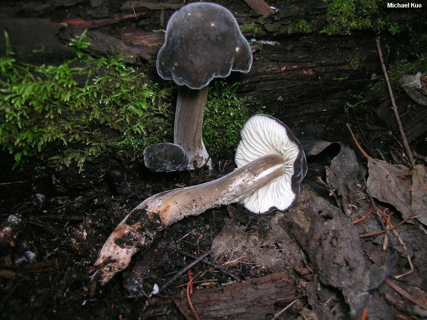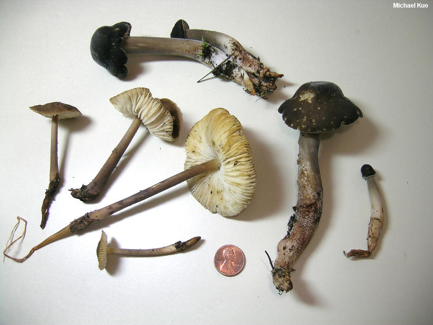 Paraxerula americana [ Basidiomycota > Agaricales > Physalacriaceae > Paraxerula . . . ] by Michael Kuo Paraxerula americana is an impressive xeruloid mushroom from the Rocky Mountains, where it appears in July and August on the deadwood of quaking aspen. Look for the dark brown, finely fuzzy surfaces of the cap and stem, and the long tap root extending underground or into the rotting wood. Since it is the only xeruloid species in its range, Paraxerula americana is not likely to be confused with morphologically similar species (eastern North America's Hymenopellis furfuracea, for example, can look similar), but its pileosetae and comparatively small spores separate it easily from other xeruloid species. Oudemansiella longipes var. americana and Xerula americana are synonyms. Description: Ecology: Saprobic on the deadwood of quaking aspen; growing alone, scattered, or gregariously, directly from very well decayed logs and stumps or attached to buried deadwood near stumps, appearing terrestrial; July and August; apparently limited to the Rocky Mountains, from New Mexico and Utah to Idaho. The illustrated and described collection is from southwestern Colorado. Cap: 2.5-7 cm; bell-shaped or irregularly convex when young, becoming broadly bell-shaped, broadly convex, or nearly flat; finely velvety when young, becoming more or less bald; smooth, or moderately radially wrinkled; dry; very dark brown (nearly black) when young, becoming dark yellowish brown to grayish brown or yellow-brown; usually manifesting a sheen in all stages of development; the margin incurved when young, sometimes uplifted in maturity, becoming faintly lined. Gills: Narrowly attached to the stem; nearly distant; white to creamy at first, becoming pale yellow; thick; short-gills frequent; cross-veins present. Stem: 6-10 cm long above ground; 0.5-1.5 cm thick; tapering a little to apex; brown to grayish brown and finely velvety to hairy throughout development; sometimes staining yellow to rusty orange where handled; with a long, tapered tap root extending up to 12 cm underground; the tap root sometimes bruising rusty brown. Flesh: Whitish; unchanging when sliced. Odor and Taste: Not distinctive. Chemical Reactions: KOH on cap surface negative. Dried Specimens: Gills of dried specimens become dingy yellowish to very pale orangish after several years in storage. Spore Print: White. Microscopic Features: Spores 9-12 x 5-8 µ; ellipsoid to very subtly amygdaliform; smooth; hyaline in KOH; inamyloid. Pleurocystidia infrequent; fusoid, with or without a neck; hyaline; to about 75 x 15 µ. Cheilocystidia utriform to clavate or subcylindric; up to 70 x 15 µ; hyaline to golden in KOH. Pileipellis hymeniform; elements subglobose-irregular to pyriform; pileosetae frequent, thick-walled, brown in KOH, up to 200 x 20 µ. REFERENCES: (Dörfelt, 1981) R. H. Petersen, 2010. (Mitchel & Smith, 1978; Pegler & Young, 1987; Redhead, Ginns & Shoemaker, 1987; Petersen & Hughes, 2010.) Herb. Kuo 08071001. This site contains no information about the edibility or toxicity of mushrooms. |