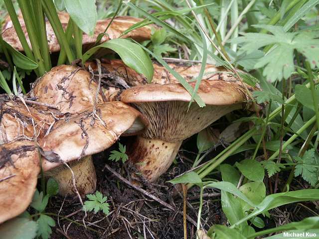 Paxillus vernalis [ Basidiomycetes > Boletales > Paxillaceae > Paxillus . . . ] by Michael Kuo Paxillus vernalis can fruit in stunning numbers under quaking aspen and paper birch in late summer and fall across northern and montane North America. On casual observation, one is likely to mistake it for a Lactarius--but it does not produce milk when sliced. In fact, close examination reveals several things that are not at all Lactarius-like: the gills separate from the cap in a layer (almost like the separable tube layers in boletes), and they are oddly pore-like and convoluted where they meet the stem. Finally, the spore print is brown, rather than pale. The better known and more widely distributed Paxillus involutus is practically identical; it features a skinnier stem (usually under 2 cm wide) and grows under a wide variety of trees. Description: Ecology: Mycorrhizal with quaking aspen or paper birch; apparently also capable of existing as a saprobe on wood and woody debris; growing scattered or gregariously; late summer and fall; fairly widely distributed in boreal and montane North America. Cap: 6-20 cm; convex to broadly convex with a strongly inrolled, cottony margin, becoming flat; the margin remaining inrolled; sticky or dry; smooth, somewhat roughened, or finely hairy; brownish yellow, becoming pale rusty brown. Gills: Running down the stem; crowded; often becoming convoluted or pore-like at the stem; yellowish to pale cinnamon or pale olive; bruising brown to reddish brown. Stem: 3-9 cm long; 2.5-5 cm thick; thick and sturdy; dry; smooth or finely hairy; colored like the cap or paler; bruising brownish to reddish brown. Flesh: Thick and firm; yellowish; discoloring reddish to brownish when exposed. Odor and Taste: Taste acidic; odor not distinctive or somewhat fragrant. Spore Print: Brown to dark brown. Microscopic Features: Spores 7.5-10 x 5-6 µ; smooth; elliptical. Pleuro- and cheilocystidia fusoid to fusoid-ventriose; 40-70 µ long; with brownish contents. Clamp connections present. REFERENCES: Watling, 1969. (Smith, Smith & Weber, 1979; Evenson, 1997; Jarosch & Bresinski, 1999; McNeil, 2006; Miller & Miller, 2006.) Herb. Kuo 08150304. This site contains no information about the edibility or toxicity of mushrooms. |