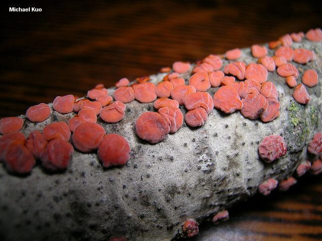 Peniophora rufa [ Basidiomycetes > Russulales > Peniophoraceae > Peniophora . . . ] by Michael Kuo Peniophora rufa is a distinctive crust fungus that forms small, bright red, cushion-shaped structures on the dead but still bark-covered branches and trunks of aspens, including quaking aspen and big-toothed aspen. Although a microscope is probably not needed in order to identify Peniophora rufa successfully, the fungus has fascinating microscopic features, including prominent gloeocystidia. Description: Ecology: Saprobic and apparently sometimes pathogenic on the wood of aspens (quaking aspen and big-toothed aspen), and occasionally on the wood of other hardwoods; erupting through the still-attached bark; spring, summer, and fall; fairly widely distributed where the host trees are present (northern and montane North America). Fruiting Body: Resupinate; usually growing in patches of cushion-shaped individual fruiting bodies measuring up to about 1 cm across and 2 mm high; surface waxy, wrinkled, red to orange-red when fresh (sometimes with a whitish dusting), becoming purplish with age. Flesh: Hard; whitish to grayish. Spore Print: White. Microscopic Features: Spores 6-9 x 2-3 µ; smooth; cylindrical to sausage-shaped; inamyloid. Basidia 4-sterigmate. Gloeocystidia pear-shaped to clavate; 10-25 µ across. Cystidia cylindric to fusiform; scarcely projecting; 5-8 µ wide; with encrusted apices. Hyphal system monomitic. Clamp connections present. REFERENCES: (Fries, 1828) Boidin, 1958. (Saccardo, 1888; McKay & Lentz, 1960; Chamuris, 1988; Lincoff, 1992; Evenson, 1997; Barron, 1999; McNeil, 2006.) Herb. Kuo 05230506; DBG RMNP 2008-006. This site contains no information about the edibility or toxicity of mushrooms. |
