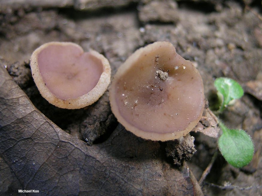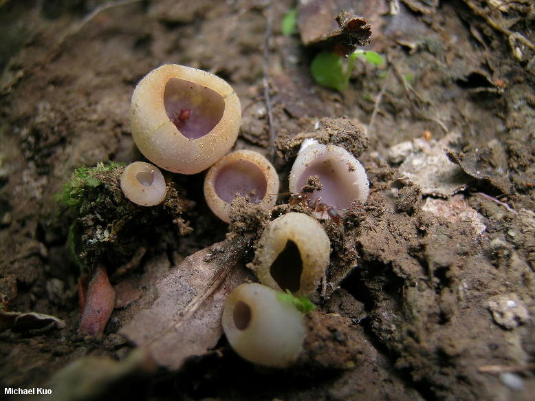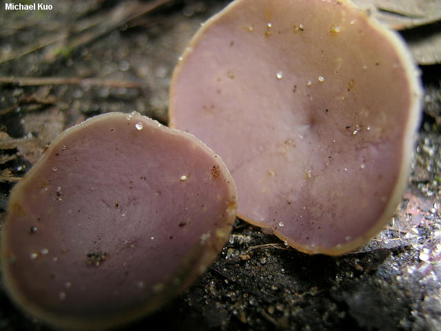 Peziza michelii [ Ascomycota > Pezizales > Pezizaceae > Peziza . . . ] by Michael Kuo I don't know what "Michael" old Boudier had in mind when he named Peziza michelii from the Parisian woods in the late nineteenth century--but I'm going to go ahead and assume that this is my cup fungus. Thanks, Jean! My cup fungus might easily be described as a purple version of the better known Peziza succosa--a brownish species that has yellowing flesh and produces a yellow juice--except that Peziza michelii is usually smaller, and a bit less juicy. Frankly, Mr. Shankly, I doubt that either of these European names should actually be applied to North American material--but let's not go there. Description: Ecology: Saprobic, or perhaps mycorrhizal; growing alone or gregariously, often near roadbanks, paths, and so on; May through September; apparently fairly widely distributed east of the Great Plains (my collections come from northern Michigan, Illinois, and Tennessee). Fruiting Body: Goblet-shaped to cup-shaped when young, becoming saucer-shaped; 5-30 mm across; upper surface bald, lilac to purple; undersurface bald or very finely granular, nearly whitish at first, becoming yellowish, staining slowly yellow; stem absent; attached to the substrate at a central location; odor and taste not distinctive; flesh whitish to yellowish, when squeezed exuding a juice that stains surfaces slowly bright yellow to brownish yellow. Spore Print: Not recorded. Microscopic Features: Spores 13-17 x 7-9 µ; at maturity warty; ellipsoid; biguttulate. Asci eight-spored; with blue tips in Melzer's reagent; up to 300 x 18 µ. Paraphyses with subclavate or merely rounded apices 3-6 µ wide. REFERENCES: (Boudier, 1891) Dennis, 1960. (Saccardo, 1895; Dennis, 1968; Breitenbach & Kränzlin, 1984.) Herb. Kuo 06160304, 09120407, 05210703, 07140805. This site contains no information about the edibility or toxicity of mushrooms. |