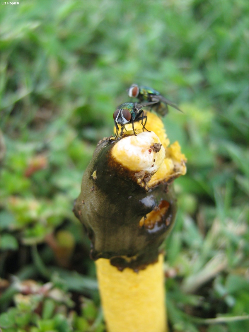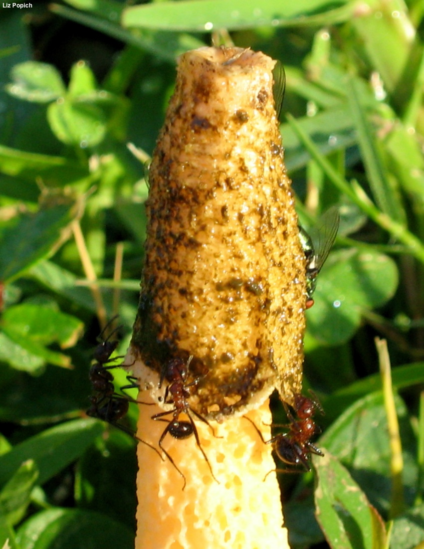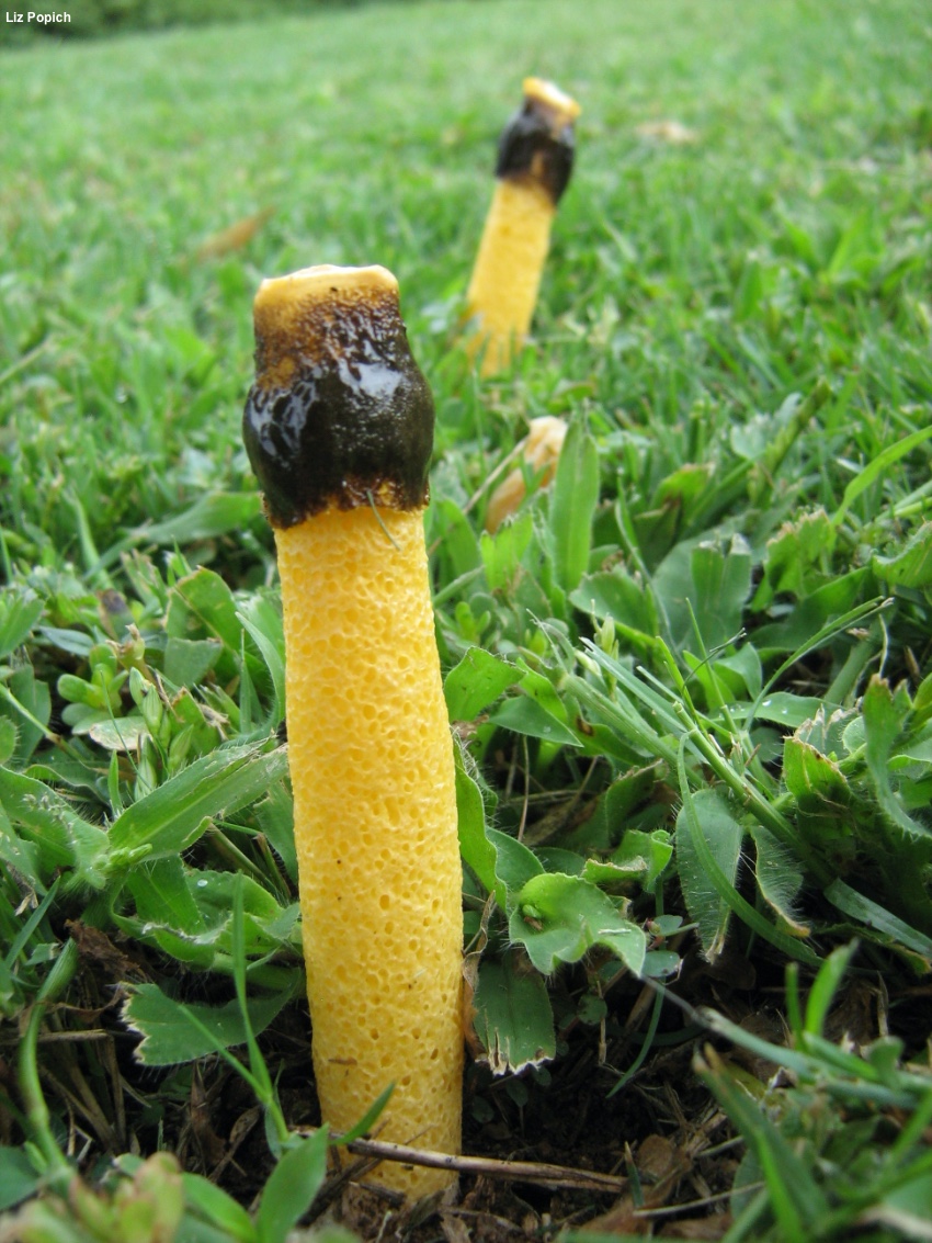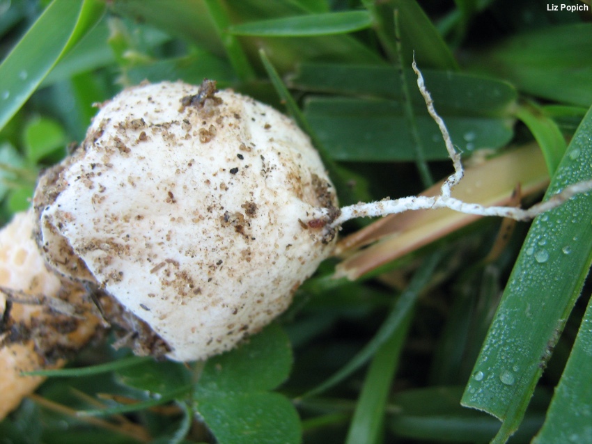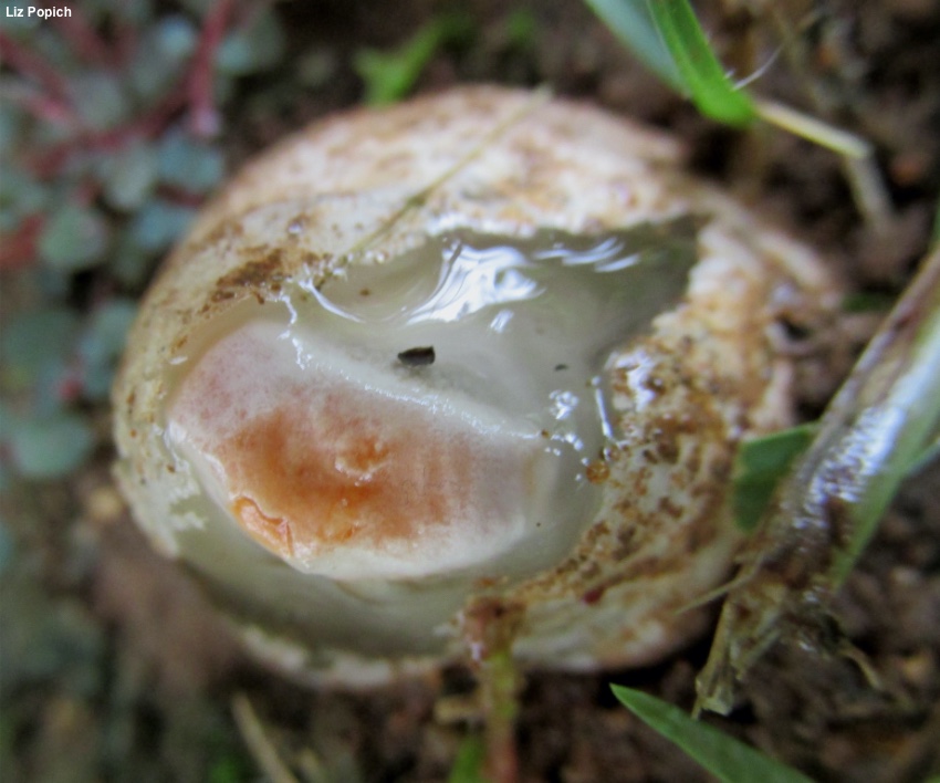 Immature Fruiting Body: Like a whitish to pale brown "egg" 1.5–2.5 cm high; when sliced revealing the stinkhorn-to-be encased in a gelatinous substance.