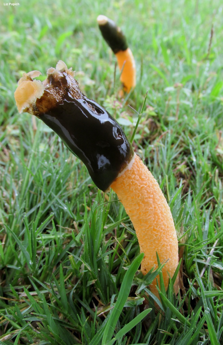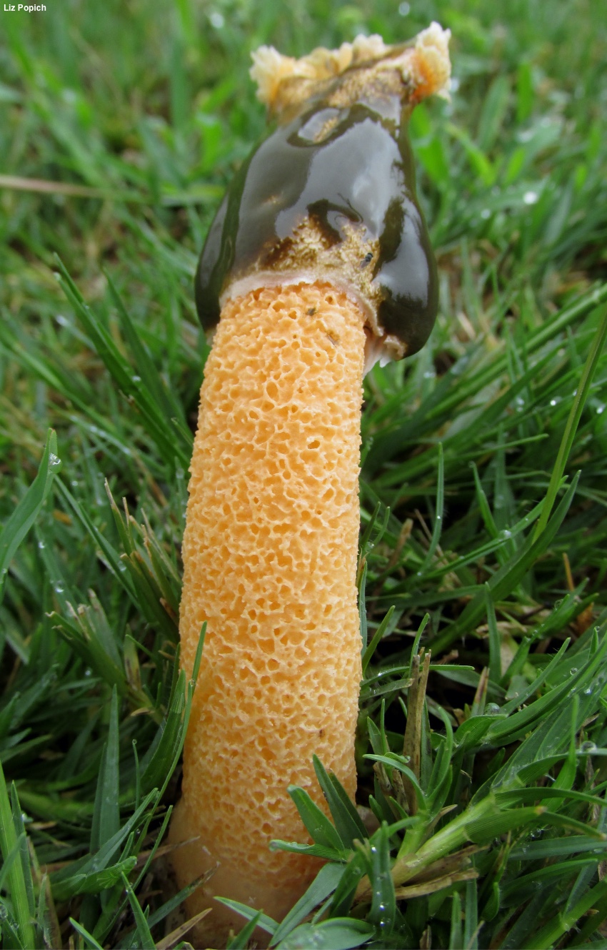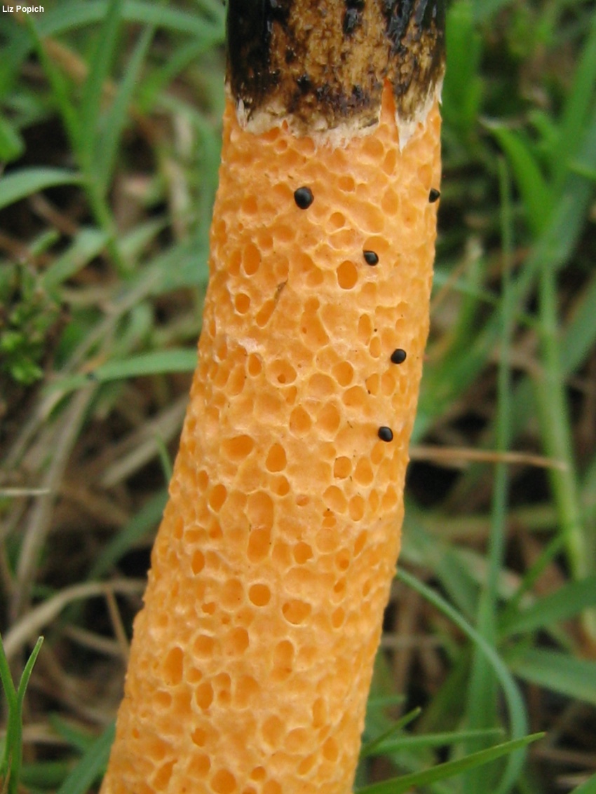 DESC. Volva globose-oblong; one finger high; one half finger wide; outer surface alutaceous, with exserted rhizoids below that are generally simple or occasionally truncated after branching, terminal rhizoids ending in small bulbs; outer surface dark, covered with a pale, gelatinous, spermatic-smelling mass that stretches up the stem toward the cap; circumscissle. At the base there is a rudimentary cupuliform second volva, connate with the base of the first, with a limb that follows the stem for two lines. Stipe cylindric, four to five thumbs high, base half a thumb wide, apex 3-4 lines wide, hollow, completely covered with chambered depressions, orange. Cap, when it erupts from the volva, covered with white mucilaginous material in which the spores (not observed) are contained; digitaliform, delicately reticulate-rugose; concolorous with the stem; 6–9 lin. high; 9 lin. in diameter at the base and at the midpoint; at the base barely contiguous with the stipe, but not adnate, apex depressed and membranous while separated from the hollow stipe, later becoming perforated, unless development in maturity proceeds in such a way that the membrane is not ruptured. Sometimes the apex of the cap is covered with torn patch of volva.