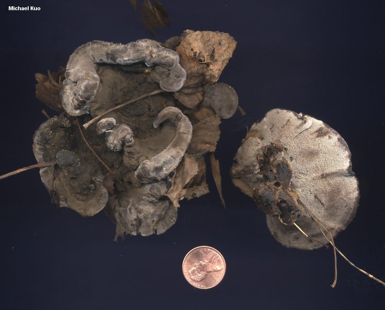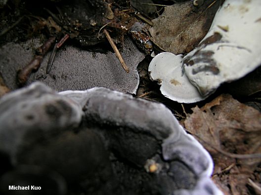 Phellodon alboniger [ Basidiomycetes > Thelephorales > Bankeraceae > Phellodon ... ] by Michael Kuo Here is an odd, spreading, toothed mushroom found in eastern North America under eastern white pine, eastern hemlock, and other conifers. It features a finely velvety, convex, gray cap with a whitish margin that often displays hints of blue. Its flesh, when sliced open, demonstrates a soft, whitish to grayish upper layer and a harder, black lower layer. Phellodon niger is very similar, and also features a lower layer of black flesh--but its cap usually becomes shallowly depressed (rather than convex), and its colors are darker. Description: Ecology: Mycorrhizal with conifers (especially eastern white pine and eastern hemlock); sometimes reported under hardwoods; growing alone or gregariously; summer and fall; widely distributed in eastern North America. Cap: Single or fused with other caps; 3-9 cm wide; convex, becoming planoconvex or nearly flat; velvety; whitish to pale gray, becoming gray with a whitish to bluish margin. Undersurface: Running down the stem; covered with crowded spines that are 2-4 mm long; whitish at first, becoming gray. Stem: 4-6.5 cm long; 1-4 cm thick at apex; extremely variable in shape; smooth or finely velvety; colored like the cap. Flesh: Two-layered, with a whitish to pale grayish, spongy upper layer and a hard, black to bluish black lower layer. Odor and Taste: Odor mild or, more commonly, fragrant (reminiscent of curry or maple syrup), becoming stronger when dried; taste mild. Chemical Reactions: KOH on flesh bluish to greenish, then brown to black. Spore Print: White. Microscopic Features: Spores 3.5-5 x 3-4.5 µ; globose to subglobose; echinulate with spines about .5 µ long. Clamp connections absent. REFERENCES: (Peck, 1898) Banker, 1906. (Saccardo, 1899; Coker & Beers, 1951; Smith, Smith & Weber, 1981; Baird, 1986; Baird & Khan, 1986.) Herb. Kuo 09130410 |