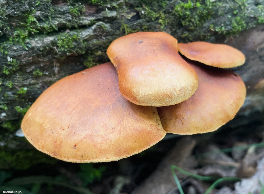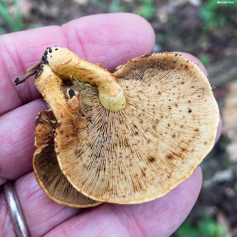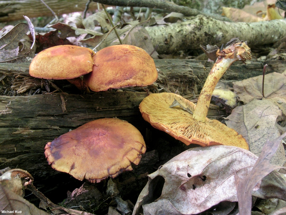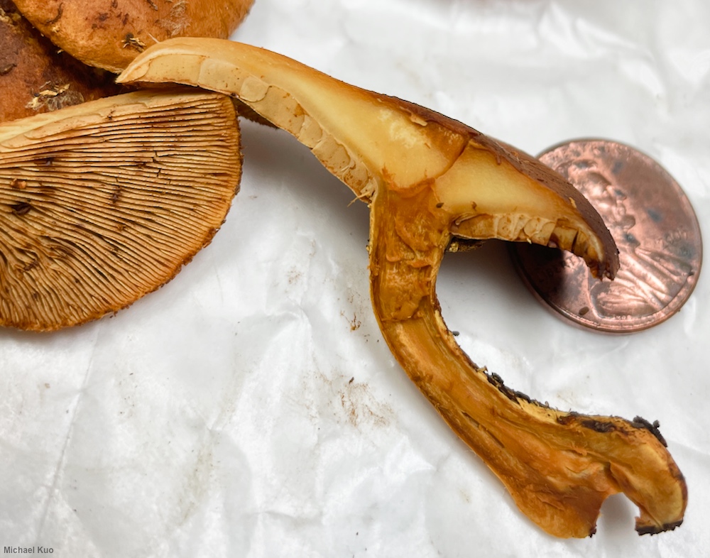 [ Basidiomycota > Agaricales > Strophariaceae > Pholiota . . . ] Pholiota multifolia by Michael Kuo, 2 August 2024 Here is an odd North American mushroom that has trouble fitting in. It is found on the deadwood of hardwoods, and its defining features include a yellow to orangish brown cap, crowded yellow gills that bruise and discolor reddish brown, flesh with a bitter taste, a cinnamon brown spore print, smooth spores, and abundant cheilocystidia. Aside from its smooth spores, Pholiota multifolia seems a good match for the genus Gymnopilus, especially since it tastes bitter like many species in that genus. Thus Murrill (1917) called it Gymnopilus multifolius. Smith & Hesler (1968), using a fairly expansive concept for the genus Pholiota, called it Pholiota multifolia. Horak (1986) placed this mushroom in Pleuroflammula, but presented no justification for the transfer from Pholiota to Pleuroflammula, other than citing study of (but no data from) the type collection—and the author's transfer flies in the face of his own concept of the genus Pleuroflammula as virtually inseparable, in the field, from Crepidotus, since "[b]oth genera form rather small conchate fruit-bodies which are attached either laterally-dorsally or by an eccentric or lateral and inconspicuous stipe to organic debris" (Horak 1978). Pholiota multifolia may turn out not to be a Pholiota once considered by an in-depth, contemporary, DNA-based analysis—but is decidedly not crepidotoid, since it features a robust, central stem, along with a thick-fleshed cap. Description: Ecology: Presumably saprobic; growing alone or, more commonly, in clusters on the deadwood of hardwoods; causing a white rot; summer and fall; originally described from St. Louis (Peck 1905); documented from the Great Lakes region, the Appalachians, the Midwest, the southern Rocky Mountains, and Washington. The illustrated and described collection is from Illinois. Cap: 3–6 cm; convex, becoming broadly convex or nearly flat; dry; bald, becoming very finely appressed-fibrillose or scaly with age; orangish yellow to brownish orange, often with a paler margin; the margin not lined. Gills: Broadly attached to the stem; crowded; short-gills frequent; bright yellow, spotting and bruising rusty brownish; edges often whitish. Stem: 2.5–5.5 cm long; up to 0.5 cm thick; equal, with a slight basal bulb; dry; fibrillose with rusty fibrils over an orangish yellow surface; with or without an obscure ring zone; basal mycelium white. Flesh: Yellow to orangish-brownish (especially in the stem); not changing when sliced. Odor and Taste: Odor not distinctive; taste bitter. Chemical Reactions: KOH deep red, then black on cap surface. Spore Print: Cinnamon brown. Microscopic Features: Tissues leach yellow pigment when mounted in KOH or Melzer's Reagent. Spores 6–8 x 4–5 µm; subellipsoid; without a pore; smooth; orangish brown in KOH; brownish-walled in Melzer's. Basidia 23–25 x 4–5 µm; subclavate; 4-sterigmate; often orangish brown in KOH. Pleurocystidia not found. Cheilocystidia 28–50 x 3–6 µm; filiform-cylindric, with capitate, clavate, or merely rounded apices; smooth; thin-walled; hyaline to yellow in KOH. Pileipellis a cutis; elements 3–10 µm; wide, smooth, yellowish in KOH. Clamp connections present. REFERENCES: (C. H. Peck, 1905) A. H. Smith & L. R. Hesler, 1968. (Murrill, 1917; Smith & Hesler, 1968; Horak, 1978; Smith, Smith & Weber, 1979; Horak, 1986; Phillips, 1991/2005; Baroni, 2017.) Herb. Kuo 09121203, 07312401. This site contains no information about the edibility or toxicity of mushrooms. |