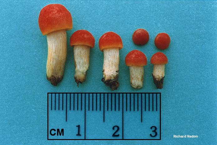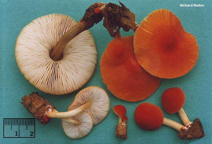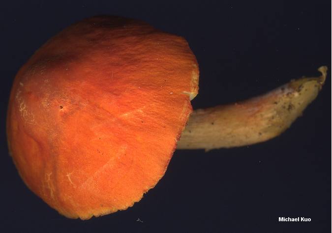 Pluteus aurantiorugosus [ Basidiomycota > Agaricales > Pluteaceae > Pluteus . . . ] by Michael Kuo What a gorgeous mushroom! Listed as rare in field guides, Pluteus aurantiorugosus is easily recognized by its habitat on wood, its pink spore print, and its scarlet to deep orange cap. I have found exactly one specimen in twenty years of mushroom hunting, so I will add my "yes" to the chorus of authors who say it is infrequently encountered. Description: Ecology: Saprobic on decaying hardwood logs and stumps; growing alone or in small groups; summer and fall; widely distributed in North America, but encountered more frequently east of the Rocky Mountains. The illustrated and described collections are from Illinois and Québec. Cap: 2-5 cm; convex at first, becoming broadly convex to nearly flat, sometimes with a central bump; dry or moist; bald, or slightly granular; the margin not lined, or only faintly lined, at maturity; bright scarlet to orange when young, fading to orangish yellow in age. Gills: Free from the stem; close or nearly crowded; short-gills frequent; whitish, becoming pinkish; often with yellowish edges. Stem: 3-6 cm long; 0.5-1 cm thick; equal; finely hairy and fibrous; whitish to yellowish above, but flushed with the cap color below; basal mycelium white or yellowish. Flesh: Pale yellowish; unchanging when sliced. Odor and Taste: Not distinctive. Spore Print: Pink. Microscopic Features: Spores 5.5-8 x 4-5 µ; ellipsoid; smooth; hyaline and uniguttulate in KOH; inamyloid. Hymenial cystidia infrequent; widely lageniform; thin-walled; to 50 x 15 µ. Pileipellis a cystoderm with inflated terminal elements. Clamp connections absent. REFERENCES: (Trog, 1857) Saccardo, 1896. (Kauffman, 1918; Homola, 1972; Smith, Smith & Weber, 1979; Lincoff, 1992; Barron, 1999; McNeil, 2006; Miller & Miller, 2006; Minnis & Sundberg, 2010; Justo et al., 2011; Kuo & Methven, 2014.) Herb. Kuo 09280301. This site contains no information about the edibility or toxicity of mushrooms. |