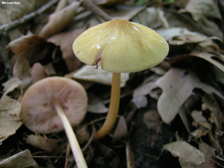 Pluteus leoninus [ Basidiomycota > Agaricales > Pluteaceae > Pluteus . . . ] by Michael Kuo Like other species of Pluteus, Pluteus leoninus has a pink spore print and gills that are free from the stem. It grows on or near the deadwood of hardwoods, and it is fairly easily distinguished from other species in the genus on the basis of its somewhat velvety yellowish cap, which usually features a brownish center, at least when young. It has a rather long stem, for a Pluteus, and it tends to appear in colder weather (late spring and fall, or over winter on the West Coast). Pluteus chrysophlebius is similar, but typically smaller, and its non-velvety cap is bright yellow, without brown shades. Pluteus leoninus is a European species, and preliminary DNA evidence (Justo et al., 2008) supports using this name for our North American versions, which often have slightly browner young caps than their European counterparts, and which have traditionally been called Pluteus flavofuligineus. However, the plot may have some twists to it once a mycologist studies this area of the genus in detail, since Justo and collaborators studied a total of four North American collections and determined that, while two of the collections "do not show molecular differentiation with European specimens," two other collections "represent a distinct molecular lineage, but . . . do not show morphological differentiation" (I was present when three of the four collections were made, and can attest to their macro-morphological inseparability). In short, there may be a "cryptic species" or two to be uncovered, so stay tuned. Description: Ecology: Saprobic, growing alone or scattered on decaying hardwood logs and debris, or growing terrestrially; causing a white rot; late spring, early summer and fall east of the Rocky Mountains, over winter on the West Coast; widely distributed in North America. The illustrated and described collections are from Illinois and Québec. Cap: 3-5 cm; convex or bell-shaped at first, becoming broadly convex or nearly flat, but often retaining a broad central bump; finely velvety to silky, especially over the center; golden to dull or brownish yellow, with a brownish center; the margin not lined. Gills: Free from the stem or nearly so; close or crowded; short-gills frequent; whitish at first, becoming pink. Stem: 5-9 cm long; up to 0.5 cm thick; tapering slightly to apex; bald or finely silky; whitish to yellowish or brownish; becoming hollow; basal mycelium white. Flesh: Thin; white; unchanging when sliced. Odor and Taste: Not distinctive. Chemical Reactions: KOH negative on cap surface. Spore Print: Pink. Microscopic Features: Spores 5.5-7 x 5-6 µ; subglobose to broadly ellipsoid; smooth; ochraceous in KOH; inamyloid. Pleurocystidia widely lageniform, subutriform, or subsaccate; thin-walled; occasionally with one or two small hooks; hyaline in KOH; scattered; to 100 x 28 µ. Cheilocystidia fusiform or narrowly lageniform; thin-walled; hyaline in KOH; often abundant; to 65 x 12 µ. Pileipellis a cutis. Clamp connections absent. REFERENCES: (Schaeffer, 1774) Kummer 1871. (Fries, 1821; Saccardo, 1887; Atkinson, 1902; Smith, 1949; Singer, 1956; Smith, Smith & Weber, 1979; Arora, 1986; Vellinga, 1990; Phillips, 1991/2005; Breitenbach & Kränzlin, 1995; Barron, 1999; Roody, 2003; McNeil, 2006; Justo et al., 2011; Kuo & Methven, 2014.) Herb. Kuo 05300402, 07010704, 06171002, 07061301. This site contains no information about the edibility or toxicity of mushrooms. |