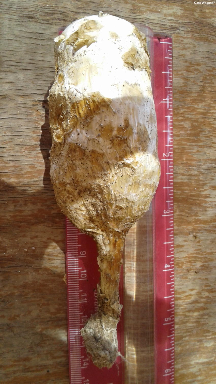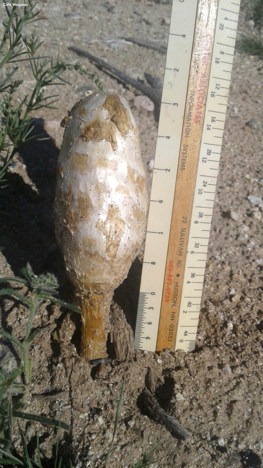 Podaxis pistillaris [ Basidiomycota > Agaricales > Agaricaceae > Podaxis . . . ] by Michael Kuo Podaxis pistillaris is found in the deserts of western North America and in Mexico, looking for all the world like an improbable shaggy mane (Coprinus comatus) that somehow managed to survive in arid conditions. But close examination reveals a key difference: the interior is not composed of crowded, deliquescing gills; instead, it consists of poorly formed, contorted, gill-like plates that eventually erode into a very dark brown or nearly black spore powder. In fact it turns out that Podaxis pistillaris is not all that closely related to Coprinus comatus, despite superficial appearances; DNA studies have placed it near lepiotoid mushrooms in the genera Leucoagaricus and Macrolepiota (see for example Vellinga and collaborators, 2011). A study of Podaxis collections (Conlon and collaborators, 2016) supported the idea that there are several species of Podaxis in need of clarification, and that spore morphology and ecology may be useful in predicting speciation. Only three North American specimens were studied, however; the remaining material was African. The North American collections formed a group that was clearly separated from the African groups—but extensive study of specimens world-wide, along with much more thorough sampling of Podaxis on our continent, will be required before we can know whether our North American version of Podaxis pistillaris is actually the same as the original species, which was named from India by Linnaeus in 1771. Podaxis longii and several other species are similar; see the key to coprinoid mushrooms (couplets 49-51) for help sorting them out. Thanks to Cate Wagoner for collecting, documenting, and preserving Podaxis pistillaris for study; her collection is deposited in The Herbarium of Michael Kuo. Description: Ecology: Presumably saprobic; growing alone or scattered in arid, desert settings—including wasteland, fields, and urban locations; fall through spring; fairly common in the deserts of the southwest and California. The illustrated and described collection is from southern California. Cap: 4–8 cm high and 2–4 cm across at maturity; oval when young, becoming more or less cylindric, with a rounded apex; shaggy to scaly; dry; white to whitish or pale brownish; the margin tucked under and attached to the stem; the outer layer shredding in old age to expose the mass of spore dust inside. Interior: Composed of vaguely gill-like, contorted plates; at first whitish but soon brownish and eventually turning into dark brown to nearly black powder. Stem: Extending into the cap; 4–10 cm long below the cap; up to 1 cm thick; more or less equal above a base that is usually buried and rooted in the sand; extremely tough and woody; coarsely fibrillose to scaly; whitish to brownish; without a ring. Flesh: Tough; whitish. Odor and Taste: Odor not distinctive. Spore Print: Not obtainable as a "spore print," but mature specimens shed very dark brown to nearly black spore powder. Microscopic Features: Spores 13–19 x 10–13 µm (but often reported as slightly smaller, around 10–15 x 9–12 µm); broadly ellipsoid; with a large pore at one end measuring 2–5 µm across; with a very thick double wall; smooth; brown in KOH. Capillitial threads 3–8 µm wide; occasionally septate; smooth; yellowish-walled in KOH; walls 1 µm thick; sometimes becoming coiled. REFERENCES: (Linnaeus, 1771) Fries, 1829. (Saccardo, 1888; Morse, 1933; Smith, Smith & Weber, 1981; Arora, 1986; States, 1990; Lincoff, 1992; Keirle et al., 2004; Miller & Miller, 2006; Vellinga et al., 2011; Desjardin, Wood & Stevens, 2015; Conlon et al., 2016; Cripps, Evenson & Kuo, 2016.) Herb. Kuo 03091701. This site contains no information about the edibility or toxicity of mushrooms. |