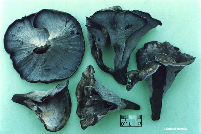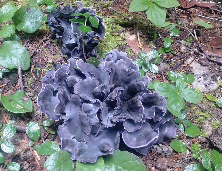 Polyozellus multiplex [ Basidiomycota > Thelephorales > Thelephoraceae > Polyozellus . . . ] by Michael Kuo Though it is sometimes called the "blue chanterelle" in field guides, this funky mushroom does not fit very well into the genus Cantharellus; mycologists currently place it in its own genus, Polyozellus, in the Thelephoraceae. Polyozellus multiplex is an inhabitant of low, wet spruce and fir forests in northern and montane North America; it usually grows in clusters (which can measure up to one meter across, according to some sources) and can be recognized by its dark, purplish to bluish black colors and the brittle-fleshed, vase-shaped individual fruiting bodies. Thanks to Laurence Boomer for collecting, documenting, and preserving Polyozellus multiplex for study; his collection is deposited in The Herbarium of Michael Kuo. Description: Ecology: Mycorrhizal with conifers--especially spruces and firs--in low, wet areas; usually growing in dense, fused clusters; northern and montane North America (from the Pacific Northwest to Maine, and in the Rocky Mountains); summer and fall. The illustrated and described collections are from Oregon, Colorado, and Québec. Individual Caps: 2-8 cm wide; more or less round in outline, or irregularly shaped; finely velvety; purple to blue or black; sometimes faintly zoned concentrically, at least texturally; with a wavy margin that is initially whitish but darkens with maturity. Undersurface: Running down the stem; smooth to wrinkled, or sometimes with gill-like folds (occasionally nearly poroid in places); colored like the cap or paler; blackening with age. Stem: 2-4 cm long; 0.5-1.5 cm thick; colored like the undersurface; fused with other stems at the base; solid or becoming hollow. Flesh: Deep purple to bluish; soft but brittle. Odor and Taste: Odor fragrant; taste mild. Chemical Reactions: KOH green on flesh. Spore Print: White. Microscopic Features: Spores 6-8 x 5-7 µ; irregular in outline; nodulose, with 6-10 nodules visible per side; nodules about REFERENCES: (Underwood, 1899) Murrill, 1910. (Saccardo, 1902; Smith & Morse, 1947; Smith, 1949; Imazeki, 1953; Bigelow, 1978; Smith, Smith & Weber, 1981; Thiers, 1985; Arora, 1986; Lincoff, 1992; Stalpers, 1993; Barron, 1999; Pilz et al., 2003; Miller & Miller, 2006; Trudell & Ammirati, 2009.) Herb. Kuo 09051302. This site contains no information about the edibility or toxicity of mushrooms. |