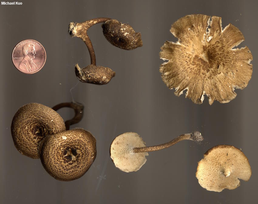 Polyporus arcularius [ Basidiomycota > Polyporales > Polyporaceae > Polyporus . . . ] by Michael Kuo East of the Rocky Mountains, this little polypore appears on the wood of hardwoods in the spring, and is often encountered by morel hunters and turkey hunters. It is fairly small, and has a central stem, along with whitish, angular pores. The most distinctive feature of Polyporus arcularius, however, is its delicately fringed, finely hairy ("ciliate," in Mycologese) cap margin. The cap color ranges from vey dark brown to pale tan. In the Rocky Mountains and in the Southwest, Polyporus arcularius appears in summer and fall, primarily on the wood of Gambel oak. Polyporus arcularius is probably headed for a new genus in the not-too-distant future; a 2008 molecular study by Sotome and collaborators found the species, along with Polyporus brumalis, to be more closely related to species of Lentinus (which feature gills!) and to Daedaleopsis confragosa than to other Polyporus species. Description: Ecology: Saprobic on the deadwood of hardwoods--especially oaks; causing a white rot; growing alone, scattered, or gregariously; occasionally arising from buried wood and appearing terrestrial; appearing in spring in eastern North America, and in summer and fall in the Rocky Mountains and the Southwest. The illustrated and described collections are from Illinois and Colorado. Cap: 1–4 cm; convex to flat or shallowly depressed; dry; finely, concentrically scaly with brown to golden brown scales and fibrils over a dull tan ground; the margin adorned with tiny projecting hairs. Pore Surface: Running down the stem; whitish at first, becoming brownish; pores 0.5–2 mm across, hexagonal or angular, radially arranged. Stem: Central or slightly off-center; 2–4 cm long; 2–4 mm wide; equal; dry; brown to yellowish brown; scaly to hairy; tough; basal mycelium whitish. Flesh: White; thin; tough; unchanging when sliced. Odor and Taste: Odor slightly fragrant, or not distinctive. Chemical Reactions: KOH negative on all surfaces. Spore Print: Creamy white. Microscopic Features: Spores 5–8.5 x 1.5–2.5 µm; cylindrical; smooth; hyaline in KOH. Basidia 27–35 µm long; 2-4-sterigmate. Hymenial cystidia absent. Pileipellis a radial cutis of brown, clamped, somewhat agglutinated elements 4–7 µm wide. Hyphal system dimitic. REFERENCES: (Batsch, 1783) Fries, 1821. (Saccardo, 1888; Overholts, 1953; Smith, Smith & Weber, 1981; Arora, 1986; Gilbertson & Ryvarden, 1987; Lincoff, 1992; Horn, Kay & Abel, 1993; Nunez & Ryvarden, 1995; Evenson, 1997; Barron, 1999; Roody, 2003; McNeil, 2006; Miller & Miller, 2006; Binion et al., 2008; Sotome et al., 2008; Kuo & Methven, 2014.) Herb. Kuo 04229503, 04309504, 05060603, 07280602. This site contains no information about the edibility or toxicity of mushrooms. |