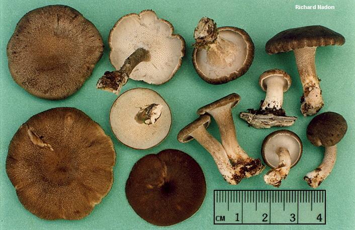 Polyporus brumalis [ Basidiomycota > Polyporales > Polyporaceae > Polyporus . . . ] by Michael Kuo This small, dark brown polypore distinguishes itself from similar species by having a stem which does not become black, a smooth (rather than hairy) cap margin, and tiny circular pores. It fruits on the deadwood of hardwoods, and has a special affinity for birch. The tough fruiting bodies are persistent and can be found year-round, but it tends to come up fresh in fall and spring. Polyporus arcularius is very similar, but features a cap margin that is fringed with tiny hairs, and a paler cap surface. Thanks to the Field Museum of Natural History for facilitating study of the collections cited below. Description: Ecology: Saprobic on decaying wood of hardwoods and especially frequent on dead birch wood; growing alone or gregariously; fall and spring, but found nearly year-round; widely distributed in North America. The illustrated and described collections are from Québec, Illinois, and Michigan. Cap: 2–8 cm; broadly convex with a tucked-under margin at first; becoming flat, or shallowly depressed; round in outline; dry; bald or very finely hairy; dark yellowish brown to dark brown. Pore Surface: Running slightly down the stem; white; not bruising; with 2–3 round pores per mm; tubes to 3 mm deep. Stem: Central or somewhat off-center; 2–4 cm long; 2–5 mm wide; equal; dry; bald or finely hairy; whitish to grayish or pale brownish; tough. Flesh: Whitish; thin; very tough. Spore Print: White.Microscopic Features: Spores 6–7 x 1–1.5 µm; cylindric; smooth; hyaline in KOH. Hymenial cystidia not found. Hyphal system dimitic. Clamp connections present. REFERENCES: (Persoon, 1794) Fries, 1818. (Fries, 1821; Saccardo, 1888; Overholts, 1953; Smith, Smith & Weber, 1981; Gilbertson & Ryvarden, 1986; Phillips, 1991/2005; Kruger, 2002; Lincoff, 1992; Nunez & Ryvarden, 1995; Barron, 1999; Roody, 2003; McNeil, 2006; Binion et al., 2008; Sotome et al., 2008.) Herb. F 1116132, 1116133, 1188572. This site contains no information about the edibility or toxicity of mushrooms. |