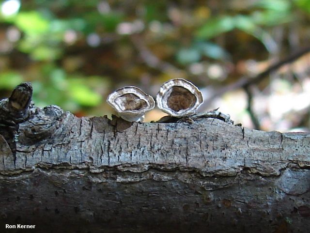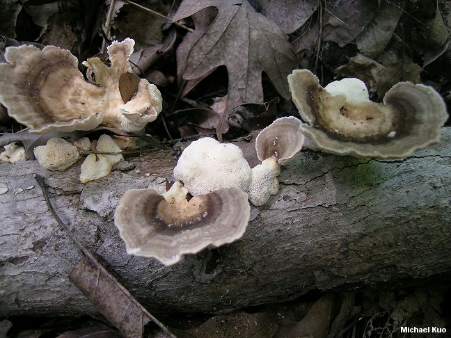 Poronidulus conchifer [ Basidiomycetes > Polyporales > Polyporaceae > Poronidulus . . . ] by Michael Kuo Poor ol' Nidulus. He's such a misfit that even Trametes got sick of him, and he had to set up his own, one-species genus. Yes, those photos all represent the same, very odd mushroom. Poronidulus conchifer (often called Trametes conchifer in field guides) starts out as a tiny, bowl-like thing that looks for all the world like a cup fungus or a bird's nest fungus without its eggs. Later, a polypore develops as an extension of the cup, often engulfing it with a pore surface or flesh. At maturity the cup can sometimes be detected as a swallowed-looking lump or disc at the base of the cap, or as a pore-covered lumpy structure that looks like a lateral stem. Bird's nest fungus expert H. J. Brodie was not really a "polypore man," but he obviously couldn't let it go when a polypore looked like a bird's nest fungus; publishing in Science (1951) he determined that the cup-like stage of Poronidulus conchifer served as a splash-cup apparatus for the distribution of asexual spores. Thus the mushroom extended its reproductive period, and hedged its bets by cloning itself before engaging in sexual reproduction and producing sexual spores like a "normal" polypore. Trametes conchifer and Polyporus conchifer are synonyms. Description: Ecology: Saprobic on the deadwood of hardwoods (primarily elms); annual; causing a white rot; growing in clusters on branches, logs and stumps; spring through fall; widely distributed from the Great Plains eastward. Fruiting Body: At first cup-like; developing a cap as an extension of the cup. Cups: Saucer- to cup-shaped; to about 15 mm wide; upper surface white to brown, usually with zones of color, smooth; undersurface white; with a tiny stem-like structure. Cap: Up to 5 cm across and 3 cm deep; semicircular, irregularly bracket-shaped, or kidney-shaped; occasionally fusing laterally with other caps; bald; radially furrowed and wrinkled; whitish to pale brownish; with concentric zones of color. Pore Surface: Whitish, becoming a little yellowish with age; with 2-4 circular to angular pores per mm; tubes to 2 mm deep. Flesh: White; fairly tough. Odor and Taste: Not distinctive. Chemical Reactions: KOH on flesh negative to yellowish. Spore Print: White. Microscopic Features: Spores 5-7 x 1.5-2 µ; smooth; cylindric; inamyloid. Cystidia absent. Hyphal system trimitic. Asexual spores produced by cups rod-shaped; 3-8 x 3 µ. REFERENCES: (Schweinitz, 1822) Murrill, 1904. (Fries, 1828; Saccardo, 1888; Brodie, 1951; Overholts, 1953; Gilbertson & Ryvarden, 1987; Phillips, 1991/2005; Lincoff, 1992; Horn, Kay & Abel, 1993; Barron, 1999; McNeil, 2006.) Herb. Kuo 04190901, 07210804. This site contains no information about the edibility or toxicity of mushrooms. |