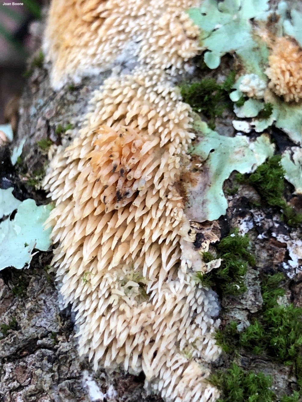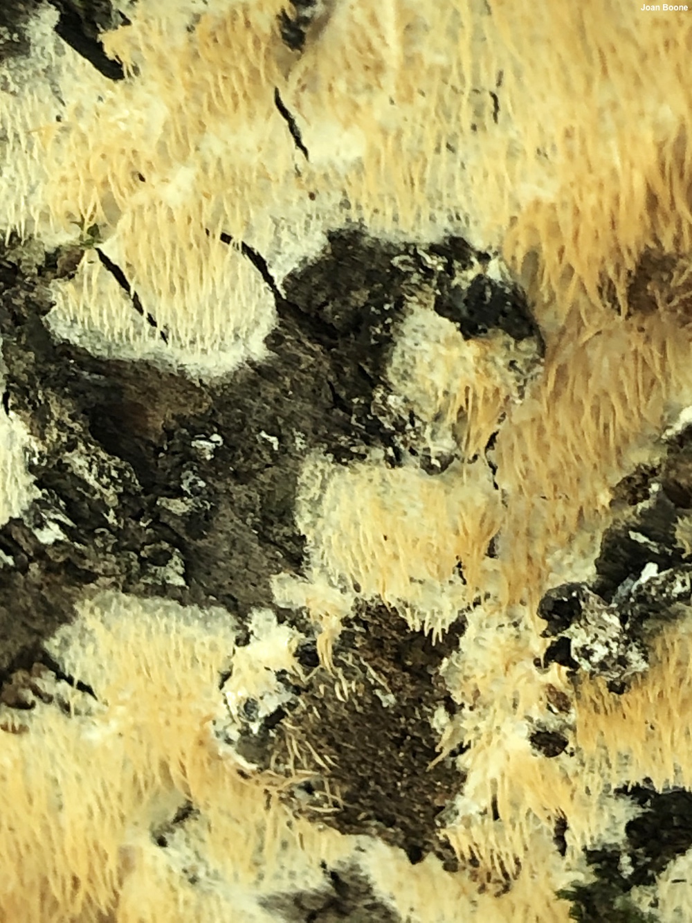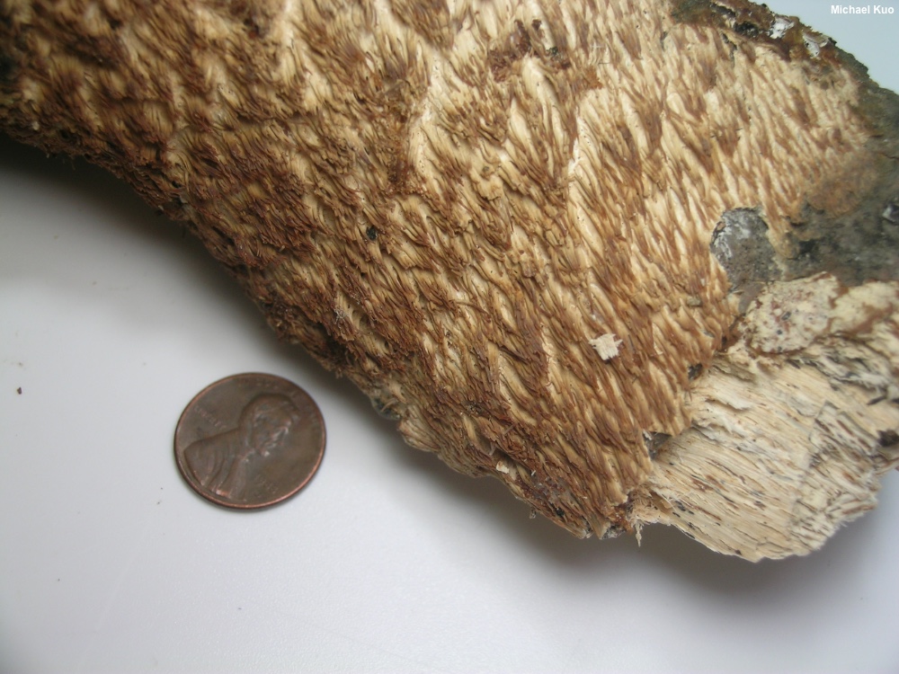 Radulomyces copelandii [ Basidiomycota > Agaricales > Radulomycetaceae > Radulomyces . . . ] by Michael Kuo Found in Asia and in the Mid-Atlantic and northeastern United States, this interesting fungus spreads in resupinate patches on the wood of hardwoods, developing small, clustered spines that are about a centimeter long. The fungus is whitish at first, but becomes yellowish and eventually brownish with age. The spines arise from a very thin mat of tissue—a "subiculum," in Mycologese—and the presence of this layer (which can be hard to see when the fungus is young) can be an important identifier, since some species of Mucronella can look virtually identical but consist of spines that arise directly from the wood, rather than from a subiculum. Radulomyces paumanokensis, described from Long Island, turns out to be a synonym for Radulomyces copelandii (Nakasone et al. 2021); it was described as a separate species since it featured thick clumps of tightly-packed spines that are often flattened and/or branched. Radulodon copelandii is a former name. Thanks to Joan Boone for collecting, documenting, and preserving Radulomyces copelandii for study; her collection is deposited in The Herbarium of Michael Kuo. Description: Ecology: Saprobic; growing on the standing or fallen deadwood of hardwoods, generally when bark is still attached, in cracks and fissures; causing a white rot; summer through winter; originally described from the Philippines; distributed widely from tropical Asia northward to Japan and Russia; in North America recorded in the northeastern and Mid-Atlantic United States. The illustrated and described collection is from Virginia. Fruiting Body: A mass of independent hanging spines arising from a thin layer of tissue (a "subiculum") that spreads across the wood in resupinate patches. Subiculum: Very thin (less than 1 mm thick); pale whitish, becoming yellowish and eventually orangish yellow to brownish with age. Spines: 4–10 mm long; 0.5–1 mm thick at the base; unbranched; bald; at first whitish and proportionally thick-fleshed, becoming yellowish to orangish yellow and narrower, with sharper apices, with age. Dried Specimens: Yellowish to brownish overall. Odor: Not distinctive. Microscopic Features: Spores 5–7 µm; globose to subglobose, with a small apiculus; smooth; hyaline and often uniguttulate in KOH; inamyloid. Basidia 28–34 x 5–8 µm; clavate; 4-sterigmate. Cystidia not found. Hyphal system monomitic; spine tramal hyphae 2–3 µm wide, smooth, thin-walled, hyaline in KOH, with clamp connections. REFERENCES: (N. T. Patouillard, 1914) K. Hjortstam & B. M. Spooner, 1990. (Hjortstam et al., 1990; Nakasone, 2001; Gilbertson & Nakasone, 2003; Ginns & Millman, 2011; Zmitrovich et al., 2017; Wang et al., 2018; Leal-Dutra et al., 2020; Nakasone et al., 2021.) Herb. Kuo 10182002. This site contains no information about the edibility or toxicity of mushrooms. |