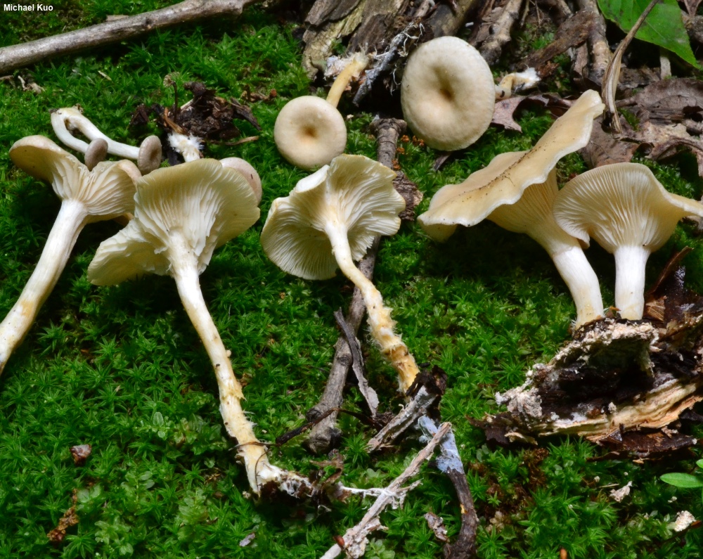 Rhizocybe species 01 [Basidiomycota > Agaricales > Tricholomataceae > Rhizocybe...] by Michael Kuo In central Illinois, this mushroom is a fairly common find in springtime. It is a pale-capped clitocyboid mushroom growing in troops and loose clusters on the deadwood and woody debris of hardwoods, featuring prominent white rhizomorphs that extend into the substrate. For almost two decades I thought this mushroom was Clitocybe eccentrica, but I have now convinced myself that it is, actually, an undescribed species of Rhizocybe (a newly erected genus for some clitocyboid mushrooms; see the discussion below). The two species can be separated by their fruiting times, their stem bases (the stem of Clitocybe eccentrica is much more prominently hairy), their cap colors, the fact that the cap of Clitocybe eccentrica tends to become split and lobed, and the colors assumed by specimens dried for the herbarium. Regular readers know that I am a taxonomic "lumper" whenever possible because painting genera in broader strokes is a better way to communicate evolution to non-specialists. In the case of "Clitocybe," however, evidence from contemporary studies (see e. g. Alvarado et al. 2015, 2018) makes it clear that the traditionally conceived genus is a hot mess, and that no amount of rational "lumping" will avoid the separation of multiple genera—unless you want to lump Collybia, Lyophyllum, Entoloma, and Tricholoma in with Clitocybe and create "Monstrocybe," the monster genus. So Rhizocybe is a thing, and it appears to correspond, more or less, to the traditional subgenus Vernae of Clitocybe: "vernae" as in vernal (occurring in spring), with species growing from wood and possessing rhizomorphs (Harmaja 1969, Bigelow 1982). The two best-known species, Rhizocybe vermicularis and Rhizocybe pruinosa, are decomposers of conifer wood and feature more pigmented caps; the species described here is quite pale, and appears on the wood of hardwoods. Description: Ecology: Saprobic; growing gregariously or in loose clusters on the deadwood or woody debris of hardwoods in oak-hickory forests; spring; distribution uncertain. The illustrated and described collections are from Illinois. Cap: 2–6 cm across; planoconvex, sometimes with a shallow navel, becoming shallowly vase-shaped with development; thin; dry; bald; very pale caramel-brownish when young, becoming whitish; the margin not lined. Gills: Running down the stem; close or nearly crowded; short-gills frequent; white. Stem: 3–7 cm long; 2–6 mm thick; more or less equal, above a slightly swollen base; dry; bald above, fuzzy near the base; with numerous white rhizomorphs attached. Flesh: Thin; whitish. Odor and Taste: Odor not distinctive; taste slightly bitter, or not distinctive. Chemical Reactions: KOH slowly yellowish to yellow on cap surface. Dried Specimens: Cap and stem creamy white; gills slightly brownish. Spore Print: White. Microscopic Details: Spores 4–5 x 2–3.5 µm; ellipsoid; with a tiny apiculus; smooth; hyaline in KOH; inamyloid; not adhering in groups. Basidia 24–27 x 4–4.5 µm; subclavate; 4-sterigmate. Cystidia not found. Pileipellis poorly defined; hyphae at surface tangled, 2.5–5 µm wide, smooth, hyaline to yellow in KOH; clamp connections present. REFERENCES: (Kuo & Methven, 2014.) Herb. Kuo 06150306, 05250404, 05300401, 05281002, 05061205, 05291305, 05271802. This site contains no information about the edibility or toxicity of mushrooms. |