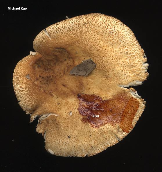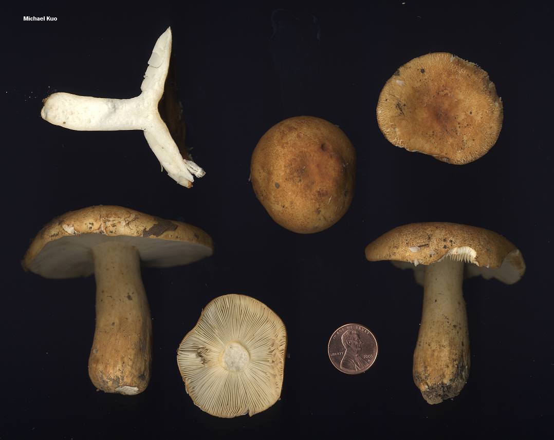 Russula ballouii [ Basidiomycetes > Russulales > Russulaceae > Russula . . . ] by Michael Kuo Russula ballouii is likely to be confused with several other species of Russula, including some of the less-stinky mushrooms in the Russula foetentula species cluster, and some of the species clustered around Russula sororia. However, Russula ballouii is odorless, and has a dry cap and stem that are densely covered with brownish yellow to reddish pigment patches that break up as the mushroom grows. It does not have a lined cap margin, and its gills do not bruise. Its taste is strongly acrid. Russula tennesseensis is a synonym, according to several authors. Description: Ecology: Mycorrhizal with oaks; growing scattered or gregariously; summer, fall, and early winter; fairly widely distributed from Texas to Illinois and New York--but apparently less common in northeastern areas. Cap: 3-9.5 cm; convex when young, later flat or broadly convex, with a central depression; dry; densely covered with pigment patches that break up as the mushroom matures; brownish yellow to rusty, orangish brown or brick red; the margin not lined; the skin not peeling easily. Gills: Attached to the stem or beginning to run down it; crowded or close; whitish to creamy; not bruising but sometimes yellowish brown where damaged by insects. Stem: 3-6.5 cm long; 1-2 cm thick; more or less equal; dry; textured and colored like the cap. Flesh: White; unchanging when sliced. Odor and Taste: Odor not distinctive, or "of bread dough" (Bills & Miller, 1984); taste acrid. Chemical Reactions: Iron salts negative to pale pink on the stem. KOH red to brownish red on cap surface. Spore Print: Whitish or creamy. Microscopic Features: Spores 7-9 x 5.5-7.5 µ; elliptical to ovoid; warts .2-1 µ high; connectors forming partial reticula. Pileipellis a cutis with areas of reddish brown, poorly defined encrusted elements; pileocystidia cylindric to subclavate, 0-2 septate, to about 100 x 8 µ, weakly ochraceous-refractive in KOH and weakly positive in sulphovanillin. REFERENCES: Peck, 1913. (Burlingham, 1915; Saccardo, 1925; Bills & Miller, 1984; Weber & Smith, 1985; Kibby & Fatto, 1990; Phillips, 1991/2005; Metzler & Metzler, 1992; Roody, 2003; Miller & Miller, 2006; Binion et al., 2008.) Herb. Kuo 09270301, 07180703. This site contains no information about the edibility or toxicity of mushrooms. |