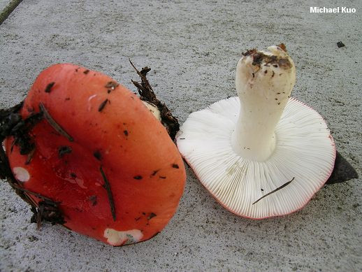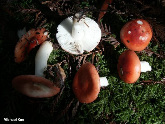 Russula cremoricolor [ Basidiomycetes > Russulales > Russulaceae > Russula . . . ] by Michael Kuo Russula cremoricolor is a winter regular in the mixed forests of coastal California. It features a white spore print, acrid taste, and a cap that is either creamy yellowish to whitish or bright red--a relatively recent idea supported by DNA evidence (Redecker and collaborators, 2001), though collectors in the area have long noted the extensive similarities between the cream and red forms (e.g. Arora, 1986). The red form has previously been labeled "Russula emetica" and "Russula silvicola"; see the comments below for more information. Microscopic features for Russula cremoricolor include spores with fairly isolated warts, and abundant pileocystidia. Description: Ecology: Mycorrhizal; found in mixed forests; typically growing gregariously but sometimes growing alone or scattered; late fall through spring; California and the Pacific Northwest. Cap: 3-10 cm; convex when young, becoming broadly convex to flat, sometimes with a shallow depression; sticky when wet; fairly smooth; bright red or creamy yellowish to nearly white; the margin usually somewhat lined at maturity; the skin peeling fairly easily, about halfway to the center. Gills: Attached to the stem; close or nearly distant; white, sometimes becoming creamy with maturity. Stem: 2-10 cm long; 1-2.5 cm thick; white; dry; fairly smooth. Flesh: White; unchanging when sliced. Odor and Taste: Odor not distinctive; taste immediately strongly acrid. Spore Print: White. Chemical Reactions: Iron salts on stem surface negative to pinkish. Microscopic Features: Spores 7.5-10.5 x 6-8.5 µ; with mostly isolated warts extending REFERENCES: Earle, 1902. (Saccardo, 1905; Burlingham, 1915; Arora, 1986; Thiers, 1997b; Redecker et al., 2001; Roberts, 2008.) Herb. Kuo 02200301, 01110603. For many years the red form of Russula cremoricolor was identified as Russula emetica--a European species that North American authors have traditionally assumed to be present on our continent. Shaffer (1975) described it from North America as a species limited to habitat in sphagnum, possessing multi-septate pileocystidia; he created Russula silvicola for eastern North American collections from different habitats, featuring non-septate or sparsely septate pileocystidia. West Coast collectors subsequently began to apply the name Russula silvicola to the red form of Russula cremoricolor. Thus it would be inaccurate to reduce Russula silvicola to synonymy with Russula cremoricolor (which is the older of the two names), since Shaffer's eastern species name was probably misapplied to West Coast material. Redecker and collaborators (2001) did not compare any of their California collections with eastern collections, nor with the type collection of Russula silvicola, from Cheboygan County, Michigan. This site contains no information about the edibility or toxicity of mushrooms. |