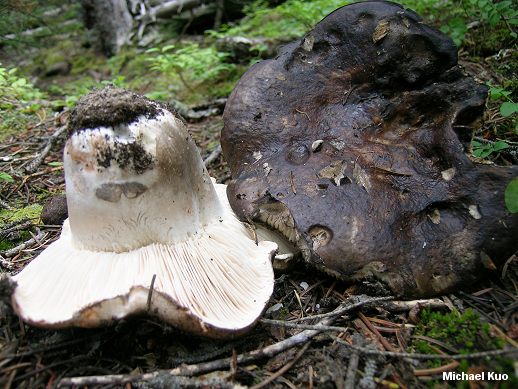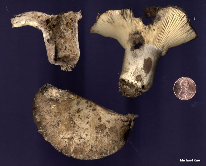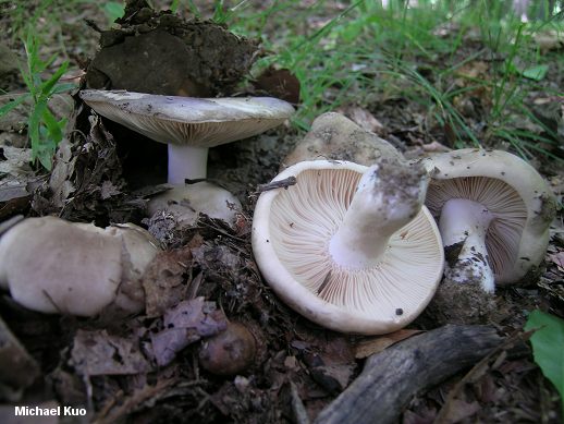 Russula densifolia [ Basidiomycetes > Russulales > Russulaceae > Russula . . . ] by Michael Kuo Russula densifolia is a blushing russula found throughout North America, featuring a whitish cap that soon becomes brown, and close or crowded gills. Under the microscope its spores are larger than those of the very similar Russula dissimulans--aka "Russula nigricans"--and the skin of its cap is much thicker and differently disposed (the gory details are below). That's the theory, anyway. The reality is that Russula densifolia is a classic European species, and that this area of the genus Russula is in desperate need of revision based on contemporary concepts. I'll bet my hat that there are at least several genetically distinct North American species in this group that have evolved as mycorrhizal partners with diverse trees in widely different ecosystems--and that the species probably cannot be reliably separated on the basis of their gill spacing, spore size, and cap skin thickness. Shaffer (1962) documents four taxonomic "forms" of Russula densifolia, based on cap colors, spore print colors, gill spacing, and tendency to grow scattered or in troops. Description: Ecology: Mycorrhizal with hardwoods or conifers; growing alone, scattered, gregariously, or in dense troops; summer and fall (also over winter in warmer climates); widely distributed in North America. Cap: 4-15 cm; broadly convex when young, later flat with a central depression, or shallowly vase-shaped; sticky at first or when wet; more or less smooth, or finely felty to the touch; initially white but soon discoloring to brownish, ashy gray, brown, or blackish; bruising slowly reddish, then blackish; the margin initially somewhat inrolled, not lined or lined faintly and widely; the cap skin peeling easily about halfway to the center. Gills: Attached or running very slightly down the stem; narrow; close or crowded (sometimes nearly distant); white to cream, eventually yellowish; bruising slowly reddish, then blackish. Stem: 1.5-9 cm long; 1-3.5 cm thick; white but soon darkening like the cap; bruising reddish, then blackish over the course of as much as half an hour; smooth or finely felty. Flesh: White; hard; bruising promptly or slowly reddish on exposure, then blackish over the course of as much as half an hour. Odor and Taste: Odor not distinctive; taste mild or slowly slightly to very acrid. Chemical Reactions: KOH on cap surface negative. Iron salts on stem surface negative. Spore Print: White. Microscopic Features: Spores 7-11 x 6-8.5 µ; elliptical to subglobose; with warts to .7 µ high; connectors usually forming partial or complete reticula. Pileipellis up to 500 µ thick; occasionally disposed as a single, cutis-like layer but more commonly two layered, with the lower level densely interwoven and cutis-like and the upper level composed of fairly erect elements embedded in a gelatinous matrix; pileocystidia absent. REFERENCES: Gillet, 1874. (Saccardo, 1887; Burlingham, 1915; Beardslee, 1918; Kauffman, 1918; Shaffer, 1962; Smith, Smith & Weber, 1979; Arora, 1986; Kibby & Fatto, 1990; Phillips, 1991/2005; Barron, 1999; McNeil, 2006; Miller & Miller, 2006; Binion et al., 2008; Roberts, 2008.) Herb. Kuo 06289502, 06150307, 08050303, 09010602, 07110705, 07160701. This site contains no information about the edibility or toxicity of mushrooms. |