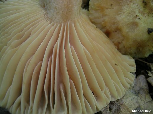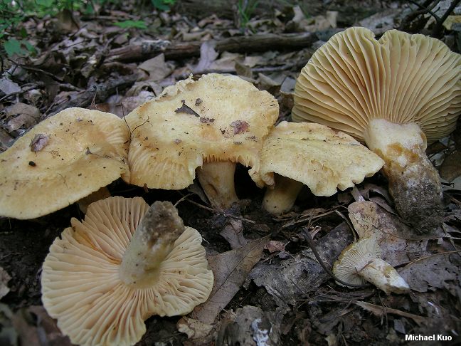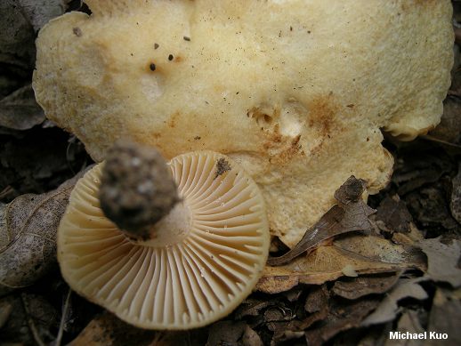 Russula earlei [ Basidiomycetes > Russulales > Russulaceae > Russula . . . ] by Michael Kuo Many mushroom hunters are familiar with Hygrophorus russula--a Hygrophorus species that looks a lot like a Russula. Russula earlei might be fairly characterized as the opposite: a Russula that looks like a Hygrophorus. Its waxy-textured cap, along with its thick and distantly spaced gills, are not typical for the genus--but once you have determined it's a russula, Russula earlei is easily identified, since nothing else (in North America) comes close. Description: Ecology: Mycorrhizal with oaks, beech, and perhaps with other hardwoods; growing alone, scattered, or gregariously; summer and fall; apparently widely distributed east of the Great Plains. Cap: 3-11 cm; convex when young, becoming broadly convex to flat, sometimes with a shallow depression; a little sticky when wet; finely rugged, with a waxy-granular feel; the surface often cracking up with age; straw yellow to dirty orangish yellow; the margin not lined, or faintly lined at maturity; the skin tightly adnate, not peeling easily. Gills: Attached to the stem or beginning to run down it; distant; whitish to creamy, becoming dull yellow; often with a water-soaked appearance; sometimes spotting and discoloring reddish brown. Stem: 2.5-7 cm long; .5-2.5 cm thick; whitish to dull yellow; dry, but with a waxy feel and a water-soaked appearance; sometimes discoloring reddish brown near the base; fairly smooth; basal mycelium white. Flesh: White to yellowish. Odor and Taste: Odor not distinctive; taste mild, or slightly bitter or acrid. Spore Print: White. Chemical Reactions: KOH on cap surface dull red to reddish brown; iron salts on stem surface negative to pinkish. Microscopic Features: Spores 3.5-6.5 x 5.5-7 µ; warts mostly isolated, extending to about REFERENCES: Peck, 1902. (Saccardo, 1905; Burlingham, 1915; Beardslee, 1918; Bills & Miller, 1984; Kibby & Fatto, 1990; Shaffer, 1990; Phillips, 1991/2005; Roody, 2003; Binion et al., 2008.) Herb. Kuo 07290702, 08020802. This site contains no information about the edibility or toxicity of mushrooms. |