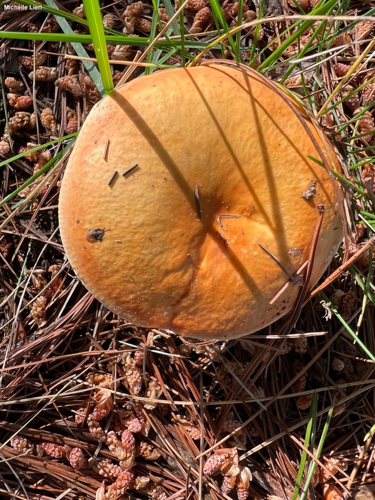 [ Basidiomycota > Russulales > Russulaceae > Russula . . . ] Russula katarinae by Michael Kuo, 29 September 2025 One of several shrimp russulas in eastern North America, Russula katarinae shares with its close relatives a shrimp- or fish-like odor, brown staining flesh and surfaces, and a color change to green when iron salts are placed on the stem surface. It can be distinguished from the other shrimp russulas by its association with eastern white pine and its bright orange cap. A similar orange shrimp russula appears in the Rocky Mountains in association with high-elevation conifers; see Russula species 03. Thanks to Michelle Lierl for documenting, collecting, and preserving Russula katarinae for study; her collection is deposited in The Herbarium of Michael Kuo. Description: Ecology: Mycorrhizal with eastern white pine; growing alone or gregariously; late summer and fall; originally described from New York (Adamčík et al 2015); distribution not yet determined, but possibly to be expected from the Great Plains eastward, throughout the range of the host tree; reported from Indiana to New York. The illustrated and described collection is from Indiana. Cap: 4–6 cm; convex, becoming broadly convex with a shallow central depression; bald; slightly wrinkled; dry; bright yellow-orange; the margin not lined. Gills: Narrowly attached to the stem; close; short-gills infrequent; whitish. Stem: 2–4 cm long; 1–1.5 cm thick; equal; dry; bald; white, bruising slowly brownish. Flesh: White; staining slowly brownish when bruised. Odor and Taste: Odor fishy; taste not distinctive. Chemical Reactions: KOH on cap surface dull yellowish. Iron salts on stem surface not documented for the described collection, but reported as green for the species. Spore Print: Dull orangish yellow. Microscopic Features: Spores 9–12 x 7–8 µm including ornamentation; ellipsoid; ornamentation as amyloid, mostly isolated warts 0.5–1.0 µm high, with few connectors; not reticulate. Basidia 38–42 x 9–12 µm; clavate; 4-sterigmate. Pleurocystidia 70–80 x 10–11 µm; fusiform; smooth; thin-walled; contents granular; hyaline in KOH. Pileipellis an ixocutis; elements 2–4 µm wide, smooth, hyaline in KOH; pileocystidia not found. REFERENCES:S. Adamčík & B. Buyck, 2015. (Adamčík et al, 2015; Adamčík et al, 2019; Noffsinger et al., 2024.) Herb. Kuo 05262401. This site contains no information about the edibility or toxicity of mushrooms. |