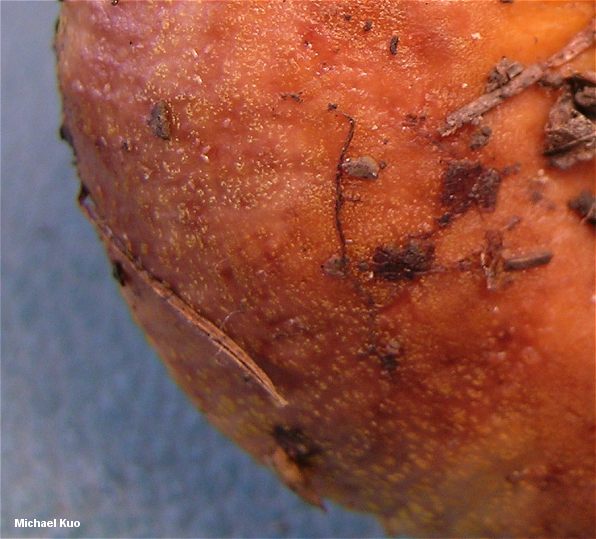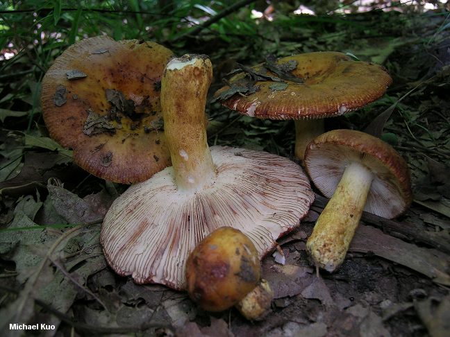 Russula mutabilis [ Basidiomycetes > Russulales > Russulaceae > Russula . . . ] by Michael Kuo One of the more distinctive members of the foetid russulas group, Russula mutabilis has a brownish orange cap that is initially covered with fine, yellowish powder--and an orangish yellow stem with a base that bruises deep red. It is associated with oaks in eastern North America. My collections of Russula mutabilis have all manifested a deep red color reaction when KOH is applied to the cap surface--a reaction not found in Russula fragrantissima, Russula laurocerasi, and other similar species. Description: Ecology: Mycorrhizal with hardwoods (probably exclusively with oaks); growing alone, scattered, or gregariously; summer and fall; apparently fairly widely distributed east of the Great Plains, from Illinois to Florida and New Jersey. Cap: 4-8 cm; convex, becoming broadly convex to flat with a shallow depression; sticky when wet and fresh; brownish orange to orangish brown; sometimes bruising slowly deep red; when young covered with fine yellow powder, especially near the margin; the margin lined; the skin peeling away easily at the margin, about halfway to the center. Gills: Attached or beginning to run down the stem; close or nearly distant; sometimes forked near the stem; creamy; often spotting or discoloring reddish brown to brownish. Stem: 2-6 cm long; 1-3 cm thick; whitish above, becoming bright yellow to orangish yellow below; bruising deep red, especially near the base; dry; more or less smooth. Flesh: Whitish. Odor and Taste: Odor weakly to moderately or strongly foul, reminiscent of maraschino cherries, almonds, or benzaldehyde; taste slowly but strongly strongly acrid. Chemical Reactions: KOH on cap surface deep red. Spore Print: Creamy. Microscopic Features: Spores 6-9 x 5-7 µ; broadly elliptical; with warts up to 1.5 µ high, connecting lines scattered and infrequent. Pileocystidia absent. Pulverulent covering composed of bundled, yellowish brown to orange-brown, cylindric to clavate elements. REFERENCES: Murrill, 1940. (Murrill, 1940; Hesler, 1960; Kibby & Fatto, 1990; Phillips, 1991/2005.) Herb. Kuo 07250303, 07300302, 07160704. My collections agree with Russula mutabilis in the sense of Kibby & Fatto (1990). However, Murrill's original description of the species does not mention yellow pulverulence, and calls for much more dramatic red staining and bruising, an only "slightly astringent" taste, and a white stem with a reddish brown base (before bruising); his description seems to match the mushroom depicted in Phillips 1991/2005) more than the one featured here. Hesler (1960), studying Murrill's type collection, found that "pulverulent areas composed of brownish, slender, erect hyphae" were "scattered over the surface," so it is possible that Murrill simply did not notice the powdery covering. Still, the differences seem fairly substantial, and it would not surprise me to find out that there are two distinct entities involved. This site contains no information about the edibility or toxicity of mushrooms. |