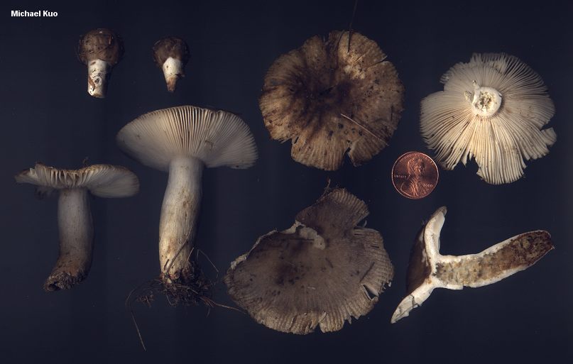 There is little chance, however, that the North American mushroom I've described and illustrated here is actually Russula sororia--a European mushroom first described by Fries in 1838. The dark brown, acrid russulas form a group that has been hotly debated for many years, and it is likely that none of the current species concepts is particularly accurate. For a thorough account of the putative differences between Russula sororia and similar brown russulas, see Roberts (2008, p. 113). Russula amoenolens and Russula pectinatoides are very similar mushrooms that feature a maraschino cherry component in their odors; the former is a little stockier than the mushroom featured here, while the latter is smaller, and features a mild taste and a paler, straw-colored cap. Description of My Collections: Ecology: Mycorrhizal with oaks or with eastern white pine; growing scattered to gregariously, sometimes in urban settings; June through October; Illinois and Missouri. Cap: 2-7 cm; convex when young, becoming broadly convex to flat with a shallow depression; sticky when young and fresh, becoming dry; fairly smooth; medium to dark grayish brown, fading somewhat with age; the margin lined and pimply for 1-1.5 cm by maturity; the skin usually peeling away easily at the margin, sometimes nearly halfway to the center. Gills: Attached or nearly free from the stem; close; not forking, or forking occasionally near the stem; with infrequent or absent short-gills; white to creamy, spotting brownish to reddish brown with age. Stem: 3-5 cm long; up to 1.5 cm thick; white, discoloring brownish to reddish brown; dry; often becoming cavernous; fairly smooth. Flesh: White; unchanging when sliced. Odor and Taste: Odor oily or waxy, sometimes with a spermatic component; taste (be sure to include the gills in your test) moderately to strongly acrid--but developing slowly, sometimes over the course of 30-60 seconds. Chemical Reactions: KOH on cap surface negative or slowly pale magenta. Iron salts on stem surface negative. Spore Print: White to creamy. Microscopic Features: Spores 6-8 x 5-7 µ; elliptical to subglobose; warts extending to .75 µ, isolated; connectors scattered and rare, not forming reticulated areas. Pleurocystidia more or less mucronate; scattered to abundant. Pileipellis a cutis of interwoven hyaline elements embedded in a gelatinous matrix; hyphal ends subacute to rounded; pileocystidia not clearly differentiated in a KOH mount. REFERENCES: Fries, 1838. (Saccardo, 1887; Kauffman, 1918; Arora, 1986; Hansen & Knudsen, 1992; Roberts, 2008.) Herb. Kuo 06249504, 08290203, 10040503, 07070707, 09190801. This site contains no information about the edibility or toxicity of mushrooms. |