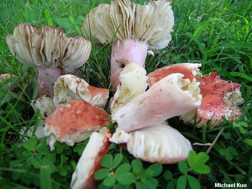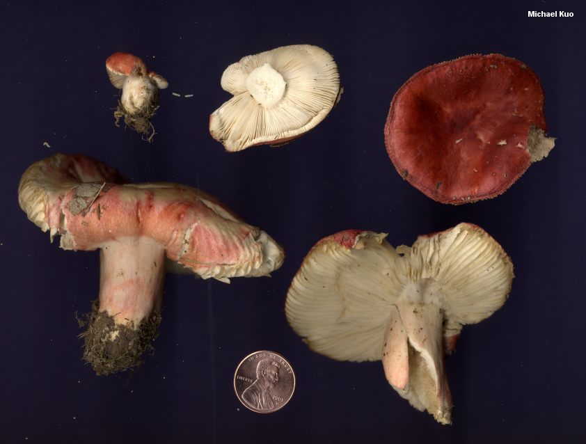 Russula tenuiceps [ Basidiomycetes > Russulales > Russulaceae > Russula . . . ] by Michael Kuo Charles Kauffman (1909) named this mushroom Russula tenuiceps (the "feeble capped russula") in order to emphasize its most distinctive feature: though it is a medium sized to large mushroom, its flesh is incredibly fragile and soon disintegrates. In fact the stem can become a hollow, brittle shell within a few hours, making Russula tenuiceps difficult to pick and take home to study in one piece. Russula tenuiceps is associated with oaks in eastern North America, and it shares many features with mushrooms in the Russula sanguinea group--including the red cap and stem, the yellowish to yellow spore print, and the acrid taste. Kauffman's original concept of this species (which he conceded was broad and might include "several forms") was in my opinion lost as later mycologists redefined and redescribed the mushroom. In particular the association with oaks and the extremely fragile flesh that inspired the Latin name have been de-emphasized or forgotten, in favor of microscopic characters that are, in my opinion, less likely to be predictive. Russula tenuiceps is so fragile that handling it casually usually results in a crumbled mess; the stem becomes hollow and brittle within a few hours of maturity, and the cap quickly falls apart. Studying Kauffman's original type collection for the species, Fatto (2002, p. 234) notes that one of the two specimens is missing a complete stem, and that both specimens "had apparently originally been consumed by maggots." My guess is that maggots had little to do with the decay and that the specimens simply demonstrate the fragile flesh Kauffman described; it is difficult to pick and preserve complete specimens. Fatto concentrates on microscopic details instead, and even eliminates with ellipses Kauffman's sentence about fragile flesh when he quotes the original description. In the same paper Fatto describes Russula subtenuiceps, which he separates on the basis of spore ornamentation, morphology of hymenial cystidia, and the frequency of pileocystidia (as well as their reaction--gray or black--to sulphovanillin), ignoring the fact that his description calls for a "firm-brittle" cap and a "stuffed" stem, as well as an association with spruce or hemlock. The mushroom that some West Coast collectors are calling "Russula tenuiceps" is not the one featured here, and does not appear to agree with Kauffman's original concept. Description: Ecology: Mycorrhizal with oaks--especially northern red oak--and perhaps with other hardwoods; growing alone, scattered, or gregariously; summer and fall; widely distributed in eastern North America. Cap: 7-12 cm; convex when young, becoming broadly convex to flat, sometimes with a shallow depression; sticky when fresh or wet; fairly smooth, or with low wrinkles; bright red but sometimes fading in age; the margin lined at maturity; the skin peeling fairly easily, often over halfway to the center. Gills: Attached to the stem or running slightly down it; close or crowded; white when young but dull yellow with maturity. Stem: 5-9 cm long; 2-2.5 cm thick; fragile and soon hollowing; flushed red over a white base color; dry; fairly smooth. Flesh: Fragile; white; unchanging when sliced. Odor and Taste: Odor not distinctive; taste strongly acrid (sometimes slowly so). Spore Print: Yellowish to orangish yellow. Chemical Reactions: KOH on cap surface negative to yellowish or orangish; iron salts on stem surface negative to slowly pinkish. Microscopic Features: Spores 6-9 x 5-7 µ; with warts REFERENCES: Kauffman, 1909. (Saccardo, 1912; Burlingham, 1915; Beardslee, 1918; Kauffman, 1918; Kibby & Fatto, 1990; Fatto, 2002.) Herb. Kuo 06269506, 06150308, 08010402, 10010409, 07140801. This site contains no information about the edibility or toxicity of mushrooms. |