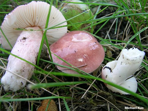 If you have matched all of these features, the odds are high that your mushroom is Russula uncialis; microscopic details (see below) will help confirm your identification. Description: Ecology: Mycorrhizal with hardwoods, especially oaks (but I have collected it in a lawn under shagbark hickory with no other trees nearby); growing alone or gregariously; often in grassy areas, and frequently found in lawns; summer and fall; eastern North America. Cap: 2-6 cm; convex, becoming broadly convex to flat with a shallow depression; rather thin and fragile; sticky when wet and fresh, but soon dry; smooth or finely dusted; dull pinkish red to blood red or rose red; evenly colored, but often with a slightly darker center; the margin becoming lined at maturity; the skin peeling fairly easily, often more than halfway to the center. Gills: Attached to the stem; close; a few forked near the stem; white; unchanging. Stem: 1-5 cm long; up to 1 cm thick; more or less equal; smooth; white, often flushed with the cap color. Flesh: White; unchanging on exposure. Odor and Taste: Odor not distinctive; taste mild. Spore Print: White. Chemical Reactions: KOH on cap surface negative to yellowish or yellow; iron salts negative on stem surface. Microscopic Features: Spores 7-9 x 5.5-7 µ; broadly elliptical; with warts projecting under 1 µ; connecting lines scattered and sparse, not forming reticula. Pileipellis a hyaline cutis with hyphal ends rounded to subacute or elongated-fusoid; pileocystidia absent. REFERENCES: Peck, 1887. (Burlingham, 1915; Beardslee, 1918; Kauffman, 1918; Kibby & Fatto, 1990.) Herb. Kuo 06140304, 07120806. This site contains no information about the edibility or toxicity of mushrooms. |