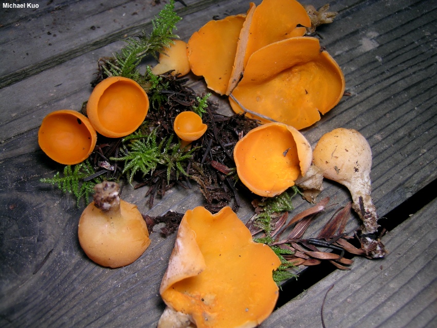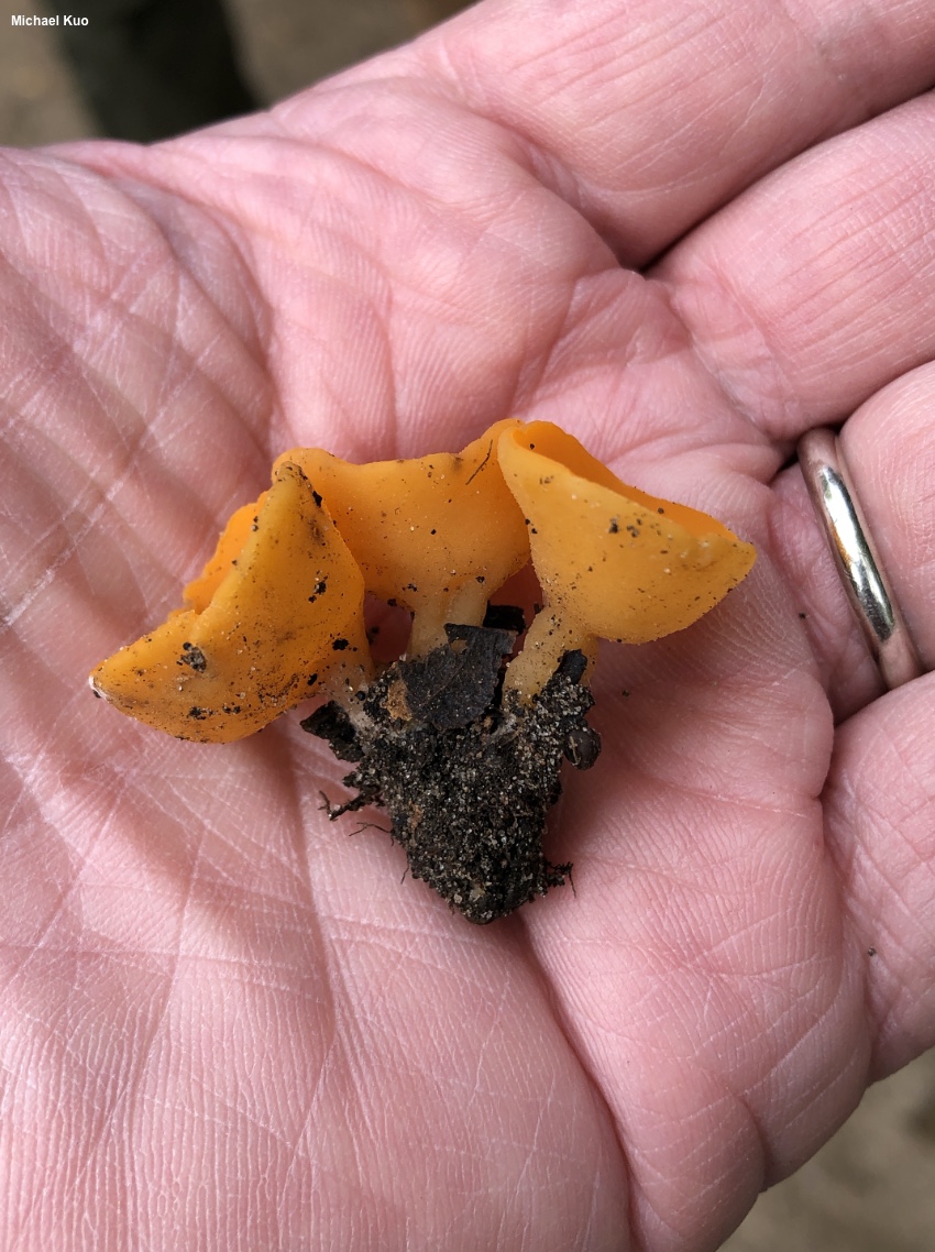 Sowerbyella rhenana [ Ascomycota > Pezizales > Pyronemataceae > Sowerbyella . . . ] by Michael Kuo This little cup fungus has a well-developed stem and a smooth, bright orange upper surface. The stem and under surface are initially pale orange to whitish, but with age become colored more or less like the upper surface of the cup. Under the microscope Sowerbyella rhenana has gorgeous, coarsely reticulate spores, along with paraphyses that are sometimes bent or "hooked" like those in the genus Otidea. Sowerbyella rhenana is often treated as a species of Aleuria ("Aleuria rhenana"), since it shares many features found in that genus, including the bright colors and the ornamented spores. But Moravic (1986) argued that the species was better placed in Sowerbyella, and DNA evidence (Perry and collaborators, 2007) supports the idea. Description: Ecology: Probably mycorrhizal (Tedersoo et al. 2010), growing gregariously or in loose clusters on the ground, usually in conifer woods; summer and fall, or over winter on the West Coast; apparently widely distributed in North America but more common in the west. The illustrated and described collections are from California and Michigan. Fruiting Body: Cup-shaped, with a stem. Cups 18–25 mm across; upper surface bald, bright orange; under surface bald, pale orange; stem 10–25 x 3–5 mm, whitish to pale orange and downy when young, becoming orange and more or less bald; flesh orangish, not changing when sliced, brittle. Odor: Not distinctive. Microscopic Features: Spores 18–22 x 10–12 µm; ellipsoid; smooth when immature, becoming ornamented with a thick, coarse reticulation; hyaline and uniguttulate in KOH; orangish golden in Melzer's. Asci 275–300 x 15–20 µm; 8-spored; hyaline in KOH; tips inamyloid. Paraphyses exceeding the asci by 5–10 µm; 3–6 µm wide; cylindric with apices subclavate to clavate (occasionally with slightly irregular swellings), straight or hooked 45–90 degrees; septate; smooth; hyaline in KOH. REFERENCES: (Fuckel, 1870) J. Moravec, 1986. (Seaver, 1928; Moravec, 1985; Arora, 1986; Moravec, 1988; Barron, 1999; McNeil, 2006; Medel et al., 2006; Yao & Spooner, 2006; Perry et al., 2007; Trudell & Ammirati, 2009; Tedersoo et al., 2010; Desjardin, Wood & Stevens, 2015; Siegel & Schwarz, 2016; Læssøe & Petersen, 2019.) Herb. Kuo 09281904. This site contains no information about the edibility or toxicity of mushrooms. |