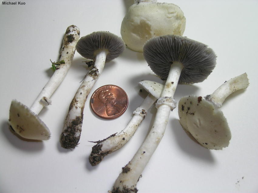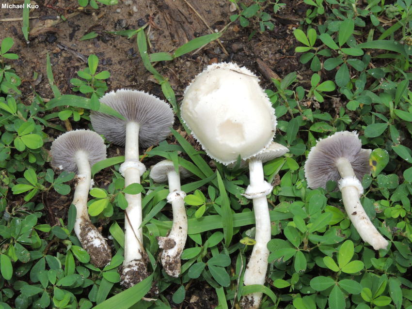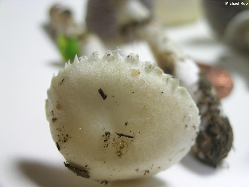 Stropharia melanosperma [ Basidiomycota > Agaricales > Strophariaceae > Stropharia. . . ] by Michael Kuo Widespread in North America but not often reported, Stropharia melanosperma grows in grassy areas and in fertilized landscaping areas. To judge from field guides and herbarium records it is more common in the southeast and in Kansas and Oklahoma than elsewhere on our continent. Distinguishing features include the white cap fringed with tooth-like veil remnants, the whitish-then-gray gills, the white ring that features a lined upper edge, and microscopic features, including fairly large spores with a slightly truncated end, and chrysocystidia (see below). Stropharia coronilla is very similar, but can be separated by its stockier stature, darker cap, and, more definitively, its smaller spores. "Stropharia melasperma" is an alternate spelling. Thanks to Joanne and Robert Solem for documenting, collecting, and preserving Stropharia melanosperma for study; their collection is deposited in The Herbarium of Michael Kuo. Description: Ecology: Saprobic, growing scattered to gregariously in grassy areas; usually found in parks, lawns, gardens, landscaping areas, and waste places; widely reported in North America. The illustrated and described collections are from Illinois. Cap: 2–5 cm; convex at first, becoming broadly bell-shaped or nearly flat; sticky when fresh; bald or very finely fibrillose; whitish overall, with a very pale, dull yellowish center—or sometimes pale straw color overall; the young margin scalloped with white, tooth-like partial veil remnants. Gills: Narrowly attached to the stem; close; short-gills frequent; whitish to very pale purplish gray at first, becoming purplish gray; edges colored like the faces. Stem: 4–8 cm long; 4–7 mm thick; equal above a slightly swollen base; bald or very finely fibrillose in places; with a high, tight ring that features a lined upper edge and which catches grayish-purplish spore dust in mature specimens; whitish; basal mycelium white. Flesh: White; unchanging when sliced. Odor: Not distinctive, or slightly foul and reminiscent of coal tar. Chemical Reactions: KOH on cap surface pale orangish pink. Spore Print: Dark purplish gray. Microscopic Features: Spores 10–13 x 6–7.5 µm; more or less ellipsoid, with one end slightly truncated by a 1–1.5 µm pore; smooth; yellow-brown in KOH; thick-walled. Basidia 4-sterigmate. Chryso-cheilocystidia abundant; 30–40 x 5–10 µm; widely fusiform, becoming rostrate with a small extension; hyaline in KOH; thin-walled; often with yellowish-refractive inclusions. Chryso-pleurocystidia scattered; similar to chryso-cheilocystidia. Lamellar trama parallel. Pileipellis a cutis; hyaline in KOH; elements REFERENCES: (Bulliard, 1793) Gillet, 1878. (Fries, 1821; Saccardo, 1887; Smith, Smith & Weber, 1979; Weber & Smith, 1985; Horn, Kay & Abel, 1003; Breitenbach & Kränzlin, 1995; Noordeloos, 1999; Ryman, 2018.) Herb. Kuo 08190201, 10030501, 06181504, 05261901. This site contains no information about the edibility or toxicity of mushrooms. |