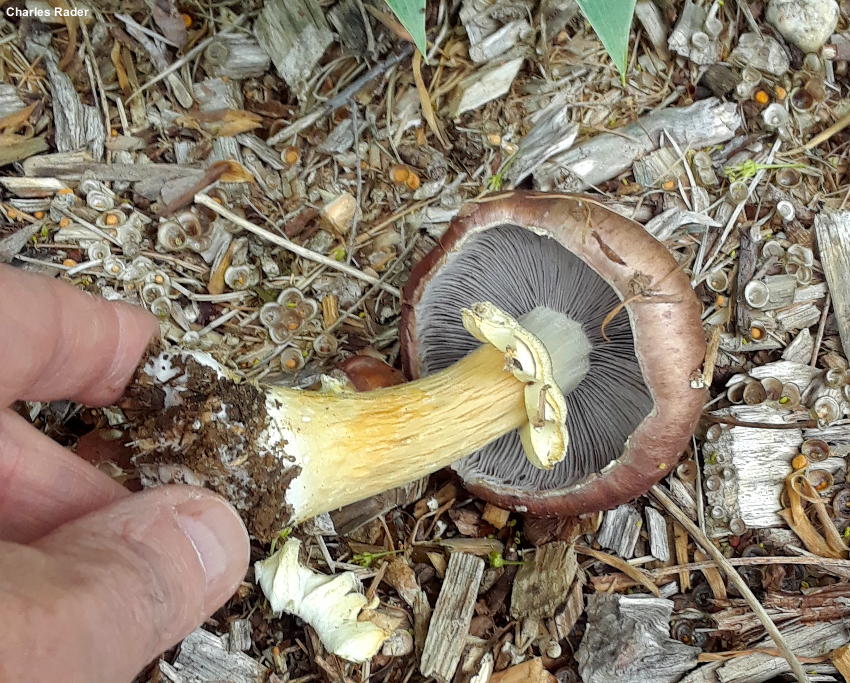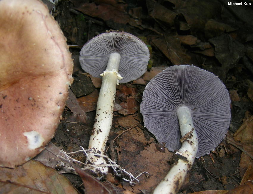 Stropharia rugosoannulata [ Basidiomycota > Agaricales > Strophariaceae > Stropharia . . . ] by Michael Kuo This beautiful mushroom is easily recognized by its preference for woodchips and other urban habitats, its purple-gray gills and spore print, and its distinctive ring, which is thick, finely lined on the upper side, and radially split or "cogwheeled" on the underside. Fresh caps are wine red to reddish brown, but they often fade to yellowish brown. A white form also occurs; I have treated it separately. I was searching rather fruitlessly for morels in Pennsylvania when a woman, out for a walk on the woodchip trail that borders my morel spot, asked what I was looking for. When I said "mushrooms," she replied, "What's wrong with these over here?" Stropharia rugosoannulata wasn't exactly what I had in mind that day, but the large clusters of mushrooms were, I had to admit, impressive. Moments later a troop of girl scouts came marching down the trail (I'm not making this up), shepherded by a very stern woman who lectured them about how fragile the forest ecosystem was, and how they should never stray from the trail or tromp around on things. There were many disapproving looks in my direction, though I tried to slip behind a large tulip tree. As the troop faded away in a haze of woodchip-directed backpacks, cell phones, and giggles, I was left to wonder whether my mushroom collecting could be as invasive as plowing up miles of trails through the woods and covering them with non-native woodchips (and all their attendant mycelia and microbes)—and to wonder why my students hate walking in the woods . . . Thanks to Charles Rader for collecting, documenting, and preserving Stropharia rugosoannulata for study; his collection is deposited in The Herbarium of Michael Kuo. Description: Ecology: Saprobic; growing scattered or gregariously (sometimes in clusters); usually found on woodchips, in gardens, and in other cultivated areas, but sometimes collected along stream beds where spring floods have occurred; spring through fall; in North America widespread and fairly common east of the Great Plains, and occasionally reported in Washington and British Columbia. The illustrated and described collections are from Pennsylvania, Massachusetts, and Illinois. Cap: 4–13 cm; convex at first, becoming broadly convex to nearly flat; sticky when fresh, but soon glossy and dry; bald; wine red to reddish brown, fading to yellowish brown or yellowish; sometimes developing cracks in old age; the margin sometimes hung with ragged partial veil remnants. Gills: Attached to the stem; close or nearly crowded; short-gills frequent; whitish to pale gray at first, becoming purplish gray to purple-black. Stem: 8–16 cm long; 1–2 cm thick; equal, or with an enlarged base; dry; bald or finely hairy; white, discoloring yellowish to brownish in age; usually featuring a thick, white to yellowish ring that is finely grooved on its upper surface (and often blackened by spores) and radially split or "cogwheeled" on its underside; base with white mycelial threads. Flesh: White; firm; unchanging when sliced. Odor and Taste: Not distinctive. Spore Print: Dark purple-brown to purplish black. Chemical Reactions: KOH on cap surface olive green. Microscopic Features: Spores 11–15 x 7–9 µm; ellipsoid, with one end slightly truncated for a large pore measuring 1-2 µm across; smooth; thick-walled; yellow-brown in KOH. Basidia 4-sterigmate. Cheilocystidia dimorphic: either 25–45 x 7.5–15 µm, fusoid-ventricose, often becoming rostrate, thin-walled, smooth, hyaline in KOH, often but not always developing globular, refractive inclusions and becoming chrysocystidia—or 35–50 x 12.5–15 µm, widely cylindric to subutriform, thin-walled, smooth (leptocystidia). Pleurocystidia similar to chryso-cheilocystidia. Pileipellis a slightly gelatinized cutis of elements 5–15 µm wide; elements smooth, hyaline to orangish brown in KOH; terminal cells cylindric with rounded apices. REFERENCES: Farlow ex Murrill, 1922. (Stamets, 1978; Smith, Smith & Weber. 1979; Arora, 1986; Phillips, 1991/2005; Lincoff, 1992; Noordeloos, 1999; Roody, 2003; McNeil, 2006; Miller & Miller, 2006; Kuo & Methven, 2014.) Herb. Kuo 05080306, 08300403, 05301701. This site contains no information about the edibility or toxicity of mushrooms. |