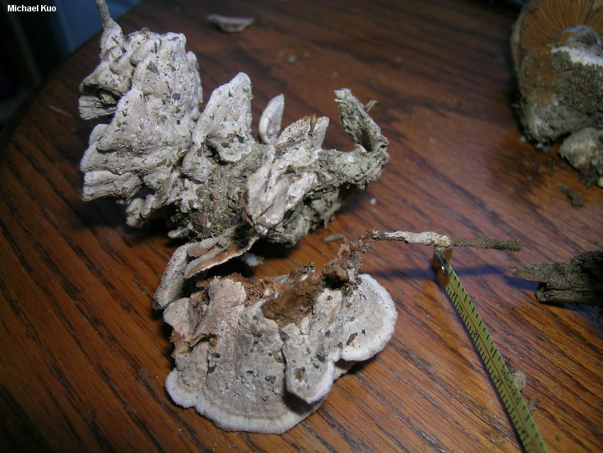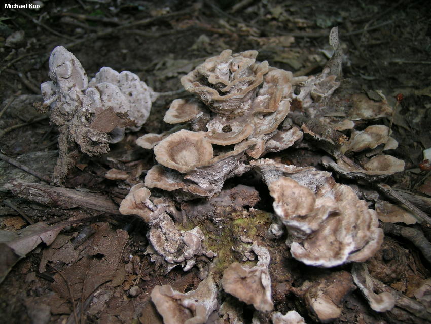 Thelephora americana [ Basidiomycota > Thelephorales > Thelephoraceae > Thelephora ... ] by Michael Kuo Thelephora americana is a hardwood-associated, terrestrial, spreading fungus that grows quickly, forming caps in clusters and rosettes, and swallowing up forest litter in the process. It is similar to the better-known Thelephora terrestris, but differs in its paler colors, smaller spores, and association with hardwoods; Thelephora terrestris is found in conifer forests. Thelephora vialis is also similar, but features cap clusters that share a more clearly defined stem structure, along with very different spores that lack true spines. Erudite taxonomic note for the day: it is unclear whether the name "Thelephora americana" is legitimately applied to the mushroom featured here, first described in 1915 by Lloyd and later emended by Corner (1968). Both Index Fungorum and MycoBank list the combination "Thelephora americana (Peck) Sacc.," from 1902, representing a mushroom originally called "Thelephora palmata var. americana" by Peck and now known as Thelephora anthocephala, as having priority. But the publication cited by both taxonomic databanks (Saccardo, 1902) does not actually elevate Peck's variety to species level; instead, it reiterates Peck's "Thelephora palmata var. americana." Description: Ecology: Mycorrhizal with oaks and other hardwoods; spreading terrestrially and forming clustered fruiting bodies; summer and fall; widely distributed in North America east of the Rocky Mountains. The illustrated and described collections are from Illinois and Ohio. Fruiting Body: A spreading mass of cap-like structures 2-5 cm high, often fused laterally and/or forming rosettes; often engulfing twigs, leaves, and small branches. Caps: 2-6 cm across; centrally depressed; irregular, but usually fan-shaped to semicircular; becoming radially wrinkled; dry; fibrillose to velvety; in old age sometimes breaking up into scales; grayish brown, with a paler, hairy margin when fresh; vaguely zoned. Undersurfaces: Smooth when young, becoming wrinkled or, in old age, developing a slightly pimpled surface; pale gray, becoming grayish brown; bruising darker brown when mature; bald. Flesh: Tough; 2-4 mm thick; pinkish brown to rusty brown; unchanging when sliced. Odor: Not distinctive. Chemical Reactions: KOH grayish to black on all surfaces and flesh. Spore Print: I have not documented the spore print; probably brown. Microscopic Features: Spores 6-9 x 5-6.5 µ (excluding ornamentation); irregular and angular; covered with spines that extend 0.5-1.5 µ; golden to brownish in KOH. Basidia 2- to 4-sterigmate; to about 65 x 12 µ. Subhymenium not bluing in KOH. Tramal hyphae cylindric; 4-6 µ wide; thick-walled, smooth, and brownish to brown in KOH; often clamped at septa. REFERENCES: Lloyd, 1915. (Corner, 1968; Stalpers, 1993.) Herb. Kuo 09250803, 07021301, 07181508. This site contains no information about the edibility or toxicity of mushrooms. |
