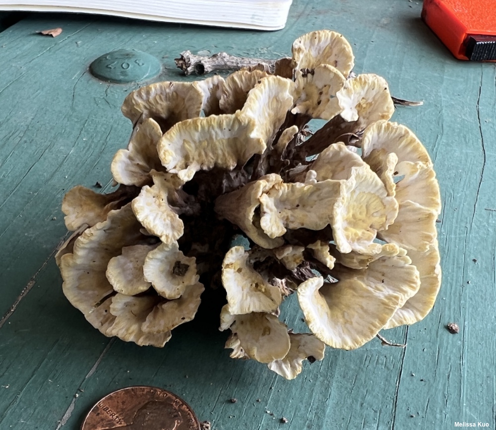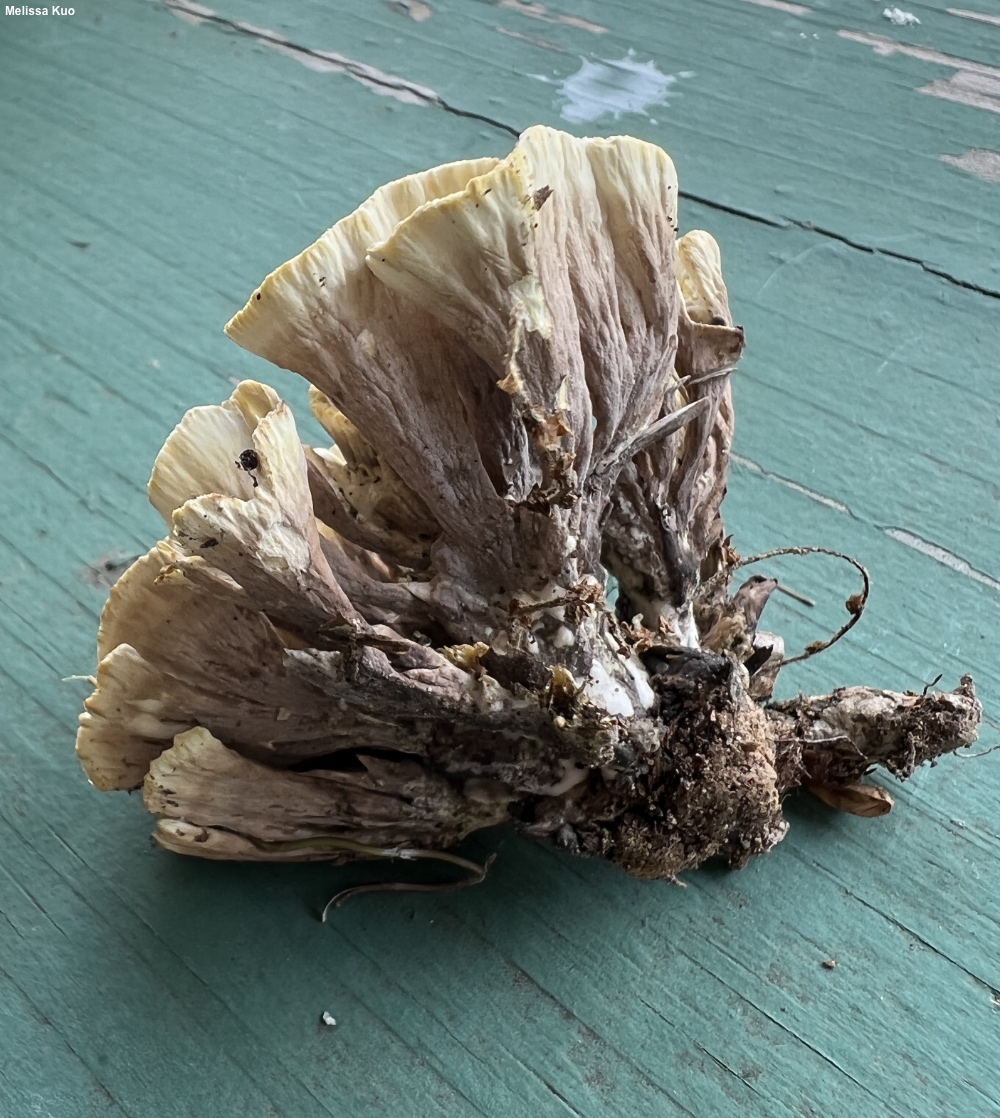 [ Basidiomycota > Thelephorales > Thelephoraceae > Thelephora ... ] Thelephora vialis by Michael Kuo, 16 October 2022 Associated with oaks, Thelephora vialis is widely distributed east of the Great Plains. It develops a vase-shaped fruiting body composed of thin lobes that are vaguely spiraling in arrangement. The upper surfaces are whitish and dull yellow, but the outer surface—where the hymenium is located—is lavender gray to brown, and becomes finely pimply with maturity. Compare Thelephora vialis with Thelephora terrestris and Thelephora americana, both of which have darker colors and, under the microscope, spiny rather than nodulose spores (additionally, Thelephora terrestris is associated with conifers). Podoscypha aculeata is somewhat similar, but its hymenium does not become dark and its spores are very different. Description: Ecology: Mycorrhizal with oaks; growing alone or gregariously, on the ground; summer and fall; originally described from North Carolina (Schweinitz 1821); widely distributed east of the Great Plains and in Mexico. The illustrated and described collection is from Ohio. Fruiting Body: A vase-shaped structure 5–10 cm across and 3–8 cm high, with vaguely concentric, spiraling lobes arranged in a rosette. Lobes: Becoming flattened toward the edges with development; upper surface radially wrinkled, bald, white and dull yellow; outer/under surface slightly wrinkled, becoming finely pimply from the base upwards with age, bald, lavender gray to brownish gray or brown below, grayish yellow above. Stems: Hard to define precisely, but generally about 2–3 cm high and up to 0.5 cm thick; tough; dark gray to blackish brown; united with other stems; basal mycelium white and copious. Flesh: Stringy; fairly tough; whitish; unchanging when sliced. Odor: Slightly foul. Chemical Reactions: KOH dark green on outer surface. Iron salts negative on outer surface. Microscopic Features: Spores 5–7 x 4–6 µm; ellipsoid-irregular; nodulose; hyaline in KOH. Basidia 30–40 x 4–6 µm; clavate; 4-sterigmate. Cystidia not found. Hyphae of the hymenium 3–5 µm wide; smooth; thin-walled; hyaline in KOH. Clamp connections present. REFERENCES: L. D. von Schweinitz, 1821. (Burt, 1914; Coker, 1921; Corner, 1968; Phillips, 1991/2005; Lincoff, 1992; Stalpers, 1993; Woehrel & Light, 2017; Sturgeon, 2018.) Herb. Kuo 07162202. This site contains no information about the edibility or toxicity of mushrooms. |