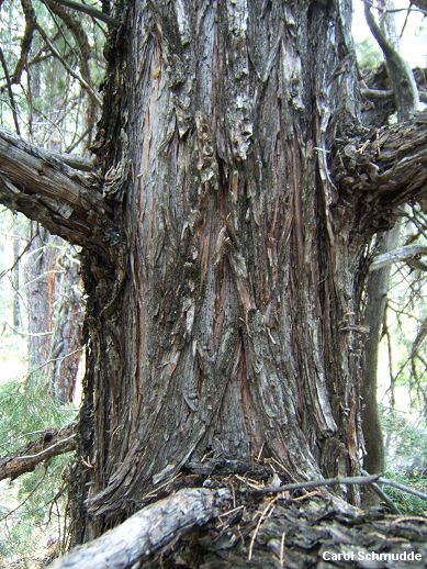 by Michael Kuo Habitat: In dry ecosystems, from deserts to ponderosa zones; in pure stands or mixed with other trees. Stature: 40-60 feet high; trunk 15-30 inches in diameter; pyramid-shaped or irregular. Needles: Scale-like and tightly pressed to branchlets; pale to dark green. Bark: Thin; in peeling strips; gray to reddish brown. Fruit: Berry-like; about 1/2 inch across; greenish at first, becoming bluish with a whitish bloom. |
