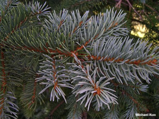 Cite this page as: Kuo, M. (2010, November). Blue spruce (Picea pungens). Retrieved from the MushroomExpert.Com Web site: http://www.mushroomexpert.com/trees/picea_pungens.html |