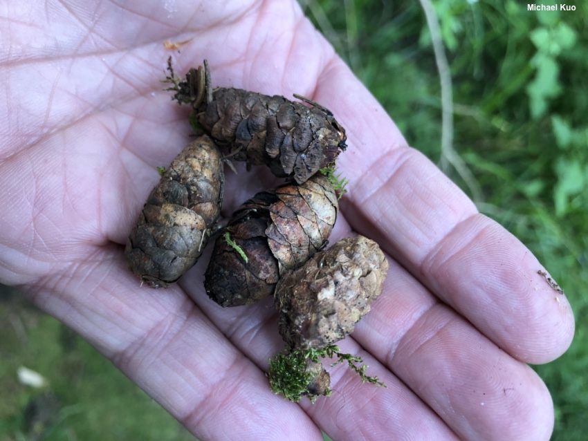 by Michael Kuo Habitat: Mountaintops in New England and the Appalachians—but also in boreal bogs and swamps. Stature: 50–70 feet tall and 1–2 feet wide; tall and narrow, with an open, pointed crown. Needles: 1–2 cm long; densely packed on twigs; 4-sided; dark green. Bark: Thin; grayish brown to reddish brown; smooth becoming scaly with age. Cones: 2–4 cm long; cylindric to egg-shaped; scales with smooth, rounded edges; purplish brown while young and attached; brown to reddish brown after falling. Frequent Mushroom Associates: Russula claroflava and many others. |