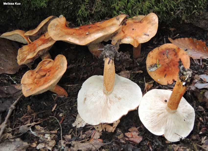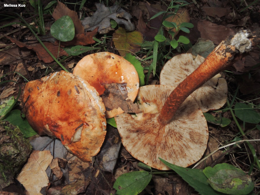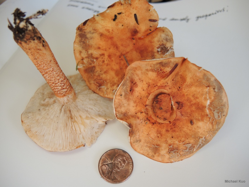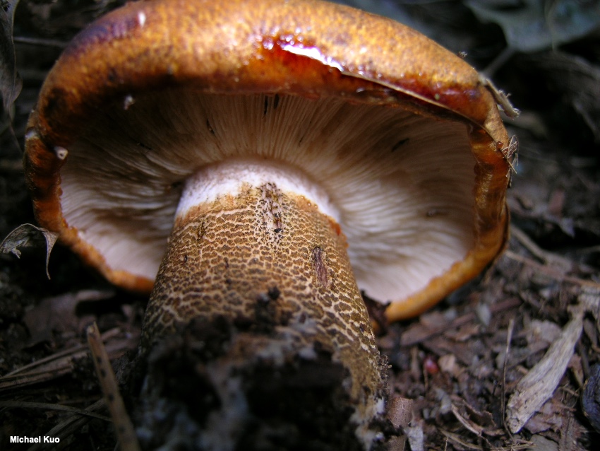 Tricholoma aurantium [ Basidiomycota > Agaricales > Tricholomataceae > Tricholoma . . . ] by Michael Kuo This gorgeous Tricholoma is easily recognized by its sticky orange cap; its mealy taste; and its distinctive stem, which features scaly orange girdles that terminate near the apex, leaving a white zone at the top and creating a sheathed appearance. However, Tricholoma aurantium has no partial veil, and the sheathed appearance results from the arrangement of the tiny scales rather than a true ring. Tricholoma aurantium is mycorrhizal with various conifers and can be found throughout much of northern and montane North America; in fact, according to a recent DNA study (Heilmann-Clausen and collaborators, 2017), its distribution is circumboreal. I am enough of a mushroom dork to have been thrilled when I discovered (while studying the "Material Cited" sections of Ovrebo's 1980 dissertation on Tricholoma—I told you I was a dork) that one of my collections of this mushroom was made in the same location as collections made by prominent mycologists over the years, including Robert Shaffer in 1968 and Nancy Weber in 1974. The Carp Creek Gorge in Cheboygan County, Michigan, is a beautiful location, and Tricholoma aurantium appears to have set up permanent residence under the stately pines found there. Description: Ecology: Mycorrhizal with conifers; growing scattered or gregariously, sometimes in clusters; fairly widely distributed in northern and montane North America (including the Rocky Mountains and the Appalachians); summer and fall. The illustrated and described collections are from Colorado, Michigan, and Kentucky. Cap: 4–9 cm; convex when young, expanding to broadly convex or nearly flat; slimy or sticky when fresh and young; orange to dull reddish orange, bruising red; fading to dirty brownish orange and often developing a fine mosaic of broken-up pigmentation; fairly bald, or with scattered, appressed fibrils and, in age, scales; the margin initially inrolled and, when fresh, adorned with droplets of red liquid. Gills: Broadly attached to the stem, or atached by a notch; crowded; short-gills frequent; creamy, developing brown to reddish brown discolorations; eventually brownish overall. Stem: 3–9 cm long; 1–2 cm thick; more or less equal, or tapering to the base; covered with dense, orange to brownish orange scaly girdles that terminate in an abrupt line near the apex; white above; basal mycelium white. Flesh: White; not changing on exposure, or turning pinkish in places. Odor and Taste: Strongly mealy. Chemical Reactions: KOH red on cap surface. Spore Print: White. Microscopic Features: Spores 3.5–5 x 2.5–3.5 µm; ellipsoid; smooth; hyaline and uniguttulate in KOH; inamyloid. Basidia 4-sterigmate. Cheilocystidia not found. Pleurocystidia not found. Lamellar trama parallel. Pileipellis an ixocutis; elements 2.5–5 µm wide, smooth, hyaline to orangish or orangish yellow in KOH. Clamp connections not found. REFERENCES: (Schaeffer, 1774) Ricken, 1915. (Quélet, 1886; Saccardo, 1887; Kauffman, 1918; Smith, Smith & Weber, 1979; Ovrebo, 1980; Arora, 1986; Phillips, 1991/2005; Lincoff, 1992; Barron, 1999; Roody, 2003; McNeil, 2006; Kuo & Methven, 2010; Bessette et al., 2013; Christensen & Heilmann-Clausen, 2013; Kuo & Methven, 2014; Siegel & Schwarz, 2016; Baroni, 2017; Heilmann-Clausen et al., 2017; Elliott & Stephenson, 2018.) Herb. Kuo 09120409, 09150714, 08140802, 10041511. This site contains no information about the edibility or toxicity of mushrooms. |