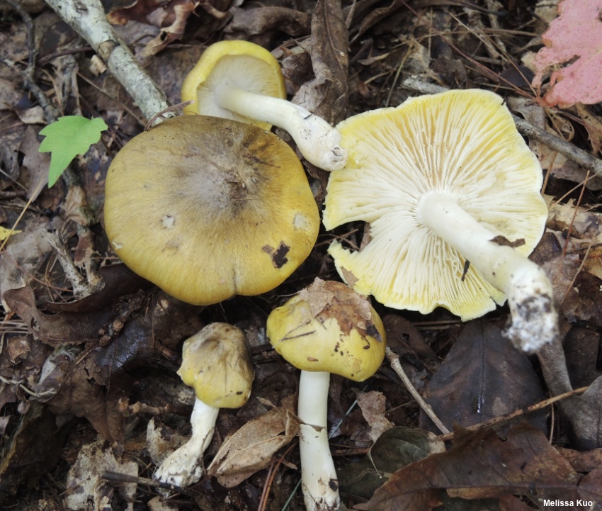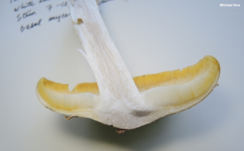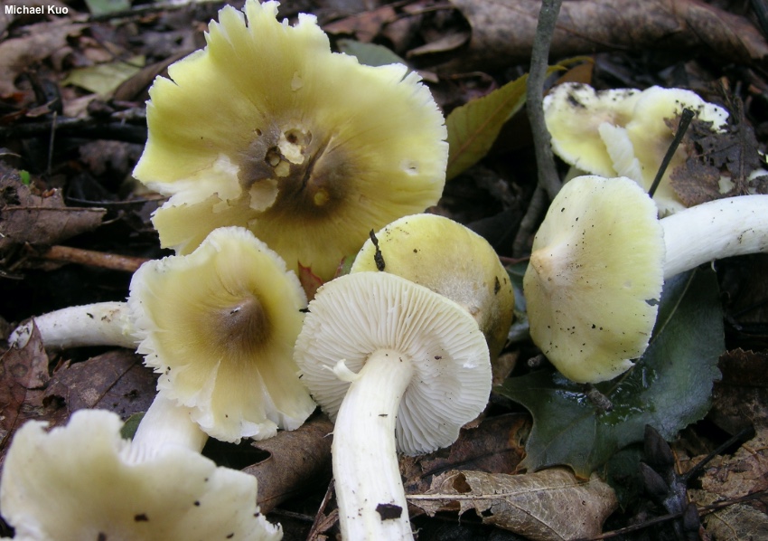 Tricholoma sejunctum [ Basidiomycota > Agaricales > Tricholomataceae > Tricholoma . . . ] by Michael Kuo First described from England during the reign of Queen Victoria, Tricholoma sejunctum is a hardwood-associated, yellow green species of Tricholoma that features a moderate covering of slightly darker, radiating, appressed fibrils, along with white gills. Its odor is strongly "farinaceous" (mealy, or cucumber-y) and, under the microscope, it lacks clamp connections. Here in North America, the name Tricholoma sejunctum has been applied very broadly, so that it has encompassed many mushrooms with features deviating somewhat from the original (for example, in having much darker radiating fibrils, or brown caps with no green or yellow shades) and/or with widely different mycorrhizal associations (for example, with conifers). However, it is now clear that it's time to begin the process of putting on the brakes; we appear to have several—even many—North American, sejunctum-like species. So, to do my part, I will narrow my use of the name sejunctum to hardwood-associated, greenish yellow collections that do not have strongly contrasting fibrils radiating from the center—although the center is often somewhat darker in color. It is possible that the collections narrowed down by this rubric are a phylogenetic match for the European Tricholoma sejunctum—but it's not very likely, since transcontinental distribution of oak-associated mycorrhizal species is very rarely upheld by DNA studies (unlike transboreal and montane, conifer- or birch-associated species, which are not uncommon). Exceptions to this "rule" usually involve human interference (see Amanita phalloides for an example). Still, at least my approach will acknowledge the current ecological and morphological boundaries of the species, and provide a little more focus. For the conifer-associated North American sejunctum-like species, see Tricholoma species 03. Description: Ecology: Mycorrhizal with oaks and other hardwoods in temperate zones; growing scattered or gregariously; North American distribution uncertain; late summer and fall. The illustrated and described collections are from Illinois, Kentucky, Michigan, and Missouri. Cap: 4–9 cm; convex with a central bump, becoming broadly convex, broadly bell-shaped, or nearly flat; sticky when fresh and young but soon dry; yellowish to olive yellow, moderately covered with grayish to olive, radiating, appressed fibers (especially over the center); the margin often brighter yellow and somewhat inrolled when young. Gills: Attached to the stem by a notch; close ; short-gills frequent; white, sometimes developing yellow stains toward the cap margin. Stem: 3–10 cm long; 1–1.5 cm thick; equal; bald; dry; whitish, sometimes with yellow tinges, or yellowish overall; basal mycelium white. Flesh: White; not changing when sliced; thick. Odor and Taste: Mealy. Chemical reactions: KOH on cap surface negative. Spore Print: White. Microscopic Features: Spores 5–8 x 3.5–5.5 µm; ellipsoid, with a small apiculus; smooth; hyaline in KOH; inamyloid. Lamellar trama parallel. Cheilocystidia sometimes present; 15–40 x 5–15 µm; clavate, sublageniform, cylindric, or somewhat irregular; thin-walled; smooth; hyaline in KOH. Pleurocystidia not found. Pileipellis an ixocutis; elements 2.5–8 µm wide, brownish walled, smooth or a little encrusted, hyaline in KOH. Clamp connections not found. REFERENCES: (Sowerby, 1799) Quélet, 1872. (Fries, 1821; Saccardo, 1887; Smith, Smith & Weber, 1979; Ovrebo, 1980; Arora, 1986; Lincoff, 1992; Shanks, 1994; Roody, 2003; Miller & Miller, 2006; Trudell & Ammirati, 2009; Christensen & Heilmann-Clausen, 2013; Kuo & Methven, 2014; Desjardin, Wood & Stevens, 2015; Heilmann-Clausen et al., 2017.) Herb. Kuo 09299603, 10020303, 09200810, 10041505. This site contains no information about the edibility or toxicity of mushrooms. |