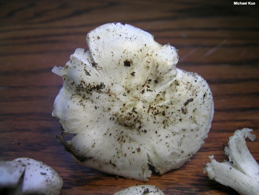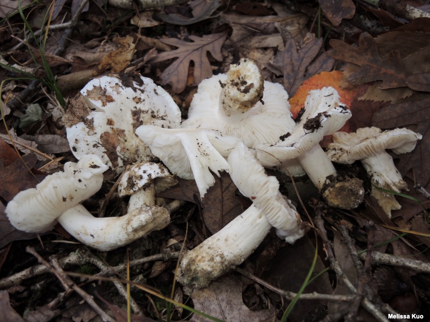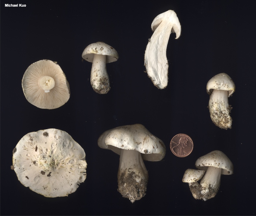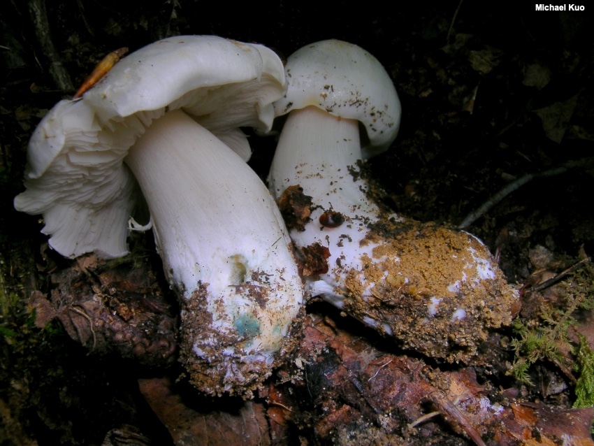 Tricholoma subresplendens [ Basidiomycota > Agaricales > Tricholomataceae > Tricholoma . . . ] by Michael Kuo I was sure that the blue stains on my otherwise white mushrooms were the result of placing them on cheap paper towels with little blue designs while I took notes in my journal. "No Tricholoma stains blue," I thought, and didn't even write down what I was seeing—this from a man who often lectures to mushroom audiences on the pitfalls of allowing one's preconceptions to determine what one observes. However, when I later found the mushroom again, displaying blue stains in the woods, I at least had the sense to refrain from expanding my paper towel theory to include obsessive-compulsive squirrels tidying up the woods with generic paper towels. Tricholoma subresplendens is recognized by its hardwood habitat, its white colors, and, yes, the presence of blue stains on the cap and stem—though the blue stains do not always appear. The cap may be pure white or develop tan shades, especially over the center. The odor and taste are usually mealy. Microscopically, the species is distinguished from similar mushrooms by the presence of clamp connections at the bases of the basidia. Tricholoma columbetta is a similar European species, and its name is often used in North American treatments for Tricholoma subresplendens. However, Ovrebo (1980) argues convincingly that our North American mushroom is distinct, since the European species lacks clamped basidia. Tricholoma resplendens is another similar European species, but it has been reduced to synonymy with Tricholoma columbetta (Christensen & Heilmann-Clausen, 2013). Description: Ecology: Mycorrhizal with hardwoods in oak-hickory and beech-maple forests, or under birch, or in mixed woods with oaks present; growing scattered or gregariously; late summer and fall; precise distribution uncertain, but, based on Tricholoma subresplendens and Tricholoma columbetta records in major herbaria, perhaps limited to eastern and northeastern North America, with the exception of some records for Alaska. The illustrated and described collections are from Illinois and Kentucky. Cap: 3–10 cm; at first broadly conical-convex, with an incurved margin; becoming broadly convex or nearly flat, with or without a central knob; sticky when fresh and young, but soon greasy to dry; bald or with minute, appressed fibers (especially over the center); white, often with tan to dull orangish brown shades, especially over the center; sometimes bruising and/or discoloring bluish to greenish. Gills: Attached to the stem by a notch; close or nearly crowded; short-gills frequent; white. Stem: 3–10 cm long; 1–2.5 cm thick; equal or somewhat swollen below; bald or with silky appressed fibers; dry; white; sometimes bruising or discoloring bluish; basal mycelium white. Flesh: White; not changing when sliced. Odor and Taste: Mealy. Chemical Reactions: KOH negative on cap surface. Spore Print: White. Microscopic Features: Spores 5–7.5 x 3–4.5 µm; ellipsoid with a narrowed apicular end; smooth; hyaline in KOH; inamyloid. Basidia 25–40 x 4–8 µm; 4-sterigmate; clavate; smooth; hyaline in KOH; basally clamped. Cystidia not found. Lamellar trama parallel. Pileipellis a cutis of elements 2.5–5 µm wide, smooth, hyaline in KOH. REFERENCES: (Murrill, 1914) Murrill, 1914. (T. columbetta/subresplendens: Kauffman, 1918; Ovrebo, 1980; Breitenbach & Kränzlin, 1991; Phillips, 1991; McNeil, 2006; Ovrebo, Hughes & Halling, 2009; Bessette et al., 2013; Christensen & Heilmann-Clausen, 2013; Kuo & Methven, 2014.) Herb. Kuo 09300305, 10150405, 09250801, 09221205, 11031801. This site contains no information about the edibility or toxicity of mushrooms. |