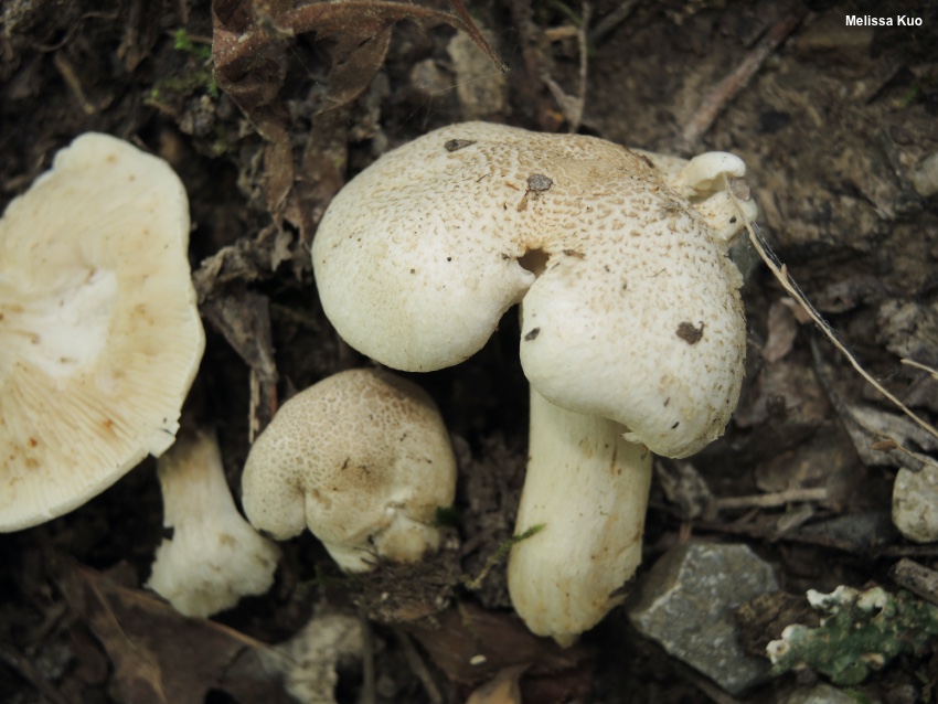 Tricholoma venenatum [ Basidiomycota > Agaricales > Tricholomataceae > Tricholoma . . . ] by Michael Kuo Although its precise range has yet to be determined, this hardwood-loving species should probably be expected in oak-hickory and beech-maple forests throughout eastern North America. It can be recognized by its whitish to pale brownish cap, overlaid with brown fibers and scales, its mealy odor, and microscopic features—including fairly large spores (for a Tricholoma), and occasional clamp connections. In western North America, Tricholoma smithii is nearly identical, but is associated with spruces and firs at high elevations. The name Tricholoma venenatum was also applied by Shanks (1994) to a robust, conifer-associated species in California; this mushroom may be Tricholoma smithii, or it may represent an unnamed species. Description: Ecology: Mycorrhizal with hardwoods in oak-hickory and beech-maple forests; growing scattered or gregariously; summer and fall; probably widespread in North America east of the Great Plains. The illustrated and described collections are from Illinois. Cap: 5–6.5 cm across; convex, becoming broadly convex to nearly flat; dry; white to whitish underneath small, light brown to brown, radially arranged scales and fibrils; the margin sometimes becoming faintly, widely lined. Gills: Attached to the stem by a notch; close or nearly crowded; short-gills frequent; whitish, aging brownish. Stem: 4–5 cm long; 1–1.5 cm thick; equal; with very fine fibrils, or more or less bald; dry; white; basal mycelium white. Flesh: White; unchanging when sliced. Odor and Taste: Mealy. Spore Print: White. Microscopic Features: Spores 6–8 x 4.5–5.5 µm; ellipsoid; smooth; hyaline in KOH; inamyloid. Lamellar trama parallel. Basidia 4-sterigmate. Cystidia not found. Pileipellis a cutis; elements 5–7.5 µm wide, smooth, hyaline to brown in KOH; occasionally clamped. REFERENCES: Atkinson, 1908. (Kauffman, 1918; Smith, Smith & Weber, 1979; Ovrebo, 1980; Bessette et al., 2013; Kuo & Methven, 2014; Ovrebo & Hughes, 2018.) Herb. Kuo 06100306, 10081806. This site contains no information about the edibility or toxicity of mushrooms. |