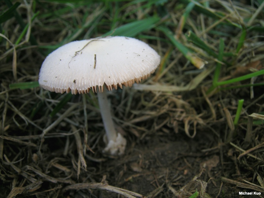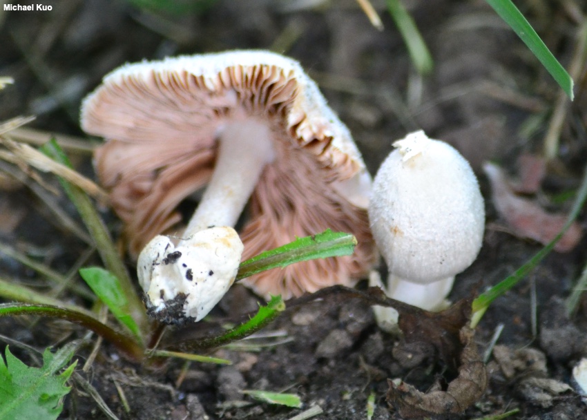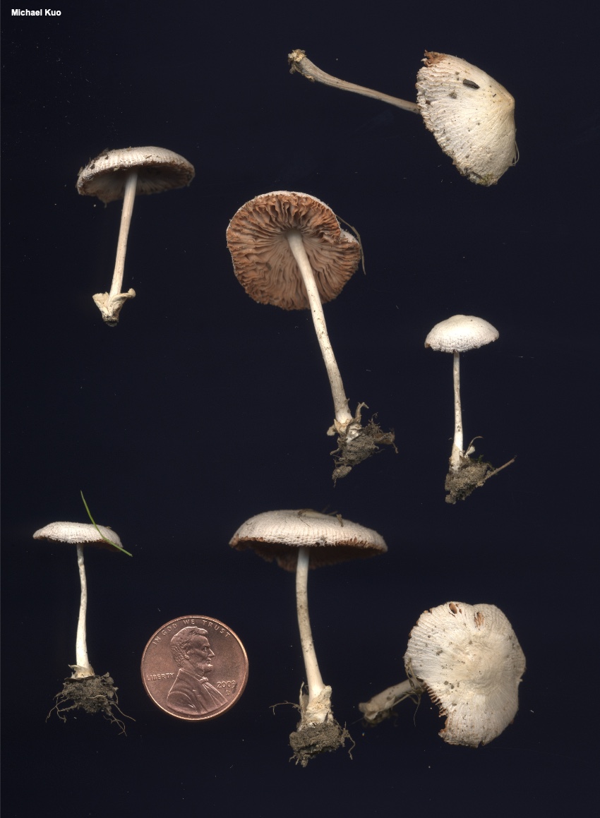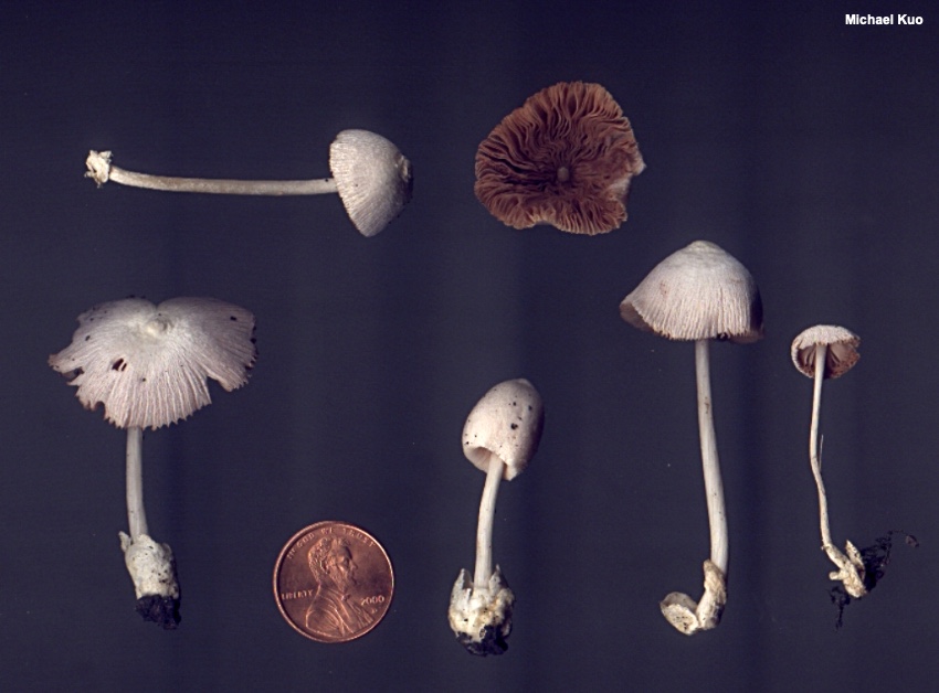 Volvariella pusilla [ Basidiomycota > Agaricales > Pluteaceae > Volvariella . . . ] by Michael Kuo This is one of several tiny, whitish Volvariella species that are quite similar—but it can be distinguished by its smooth stem and its lined cap margin. The closest commonly found look-alike, Volvariella hypopithys, has a densely but finely hairy stem, and a non-lined margin, while other known look-alikes have caps that are not completely white. Volvariella pusilla is listed in many sources as growing in gardens, lawns, and other cultivated habitats, and I suspect that it is partial to the disturbed ground of these settings (like some morels, including Morchella rufobrunnea). In my experience Volvariella pusilla does, indeed, appear in lawns, including my own, and it often creates a fantastic excuse to stop mowing in the middle of the job, in order to admire the little mushrooms, photograph them, collect them, talk to them (my neighbors are used to this kind of behavior) . . . anything but start mowing again. Description: Ecology: Apparently saprobic; growing alone or gregariously; usually reported from gardens, lawns, wood chips, and so on—but found in woods as well, at least in areas of disturbed ground like pathsides; spring through fall; distributed primarily east of the Rocky Mountains, although it is occasionally reported from western North America. The illustrated and described collections are from Illinois. Cap: 1–3 cm across; egg-shaped at first, becoming convex to broadly convex, broadly bell-shaped, or nearly flat; dry; finely silky; whitish; becoming finely lined from the margin about halfway to the center. Gills: Free from the stem; close or crowded; whitish becoming pink to brownish pink. Stem: 2–5 cm long; 2–3 mm thick; more or less equal; dry; bald or with a few fibrils, but not hairy or fuzzy; white; without a ring; the base encased in a thick, white to grayish, sack-like, flaring volva which may be buried. Flesh: Thin; white; not changing when sliced. Odor and Taste: Not distinctive. Chemical Reactions: KOH negative on cap surface. Spore Print: Brownish pink. Microscopic Features: Spores 5–7.5 x 4–5 µm; more or less ellipsoid; thick-walled; smooth; hyaline to yellowish in KOH. Basidia 4-sterigmate. Cheilocystidia and pleurocystidia to 50 x 17.5 µm; lageniform to widely lageniform or obpyriform; smooth; thin-walled; hyaline in KOH. Pileipellis a trichoderm of very long, cylindric elements 7.5–25 µm wide, smooth, hyaline in KOH, septate; terminal cells cylindric with rounded apices, or clavate and swollen up to 40 µm wide. Clamp connections not found. REFERENCES: (Persoon, 1799) Singer, 1951. (Fries, 1821; Kauffman, 1918; Coker, 1947; Shaffer, 1957; Smith, Smith & Weber, 1979; Arora, 1986; Monoson, Methven & Sundberg, 1993; Breitenbach & Kränzlin, 1995; Miller & Miller, 2006; Justo, 2010; Justo et al., 2011b.) Herb. Kuo 08010201, 08240503, 06201401. This site contains no information about the edibility or toxicity of mushrooms. |