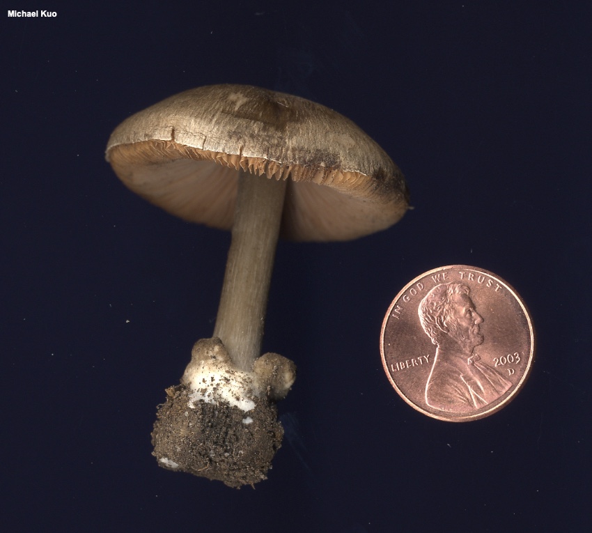 Volvariella taylorii [ Basidiomycota > Agaricales > Pluteaceae > Volvariella . . . ] by Michael Kuo The illustrated collections are a plausible match for Volvariella taylorii, a European species recorded in North America by several Volvariella authors (Shaffer 1957; Monoson, Methven & Sundberg, 1993). Distinguishing features include the relatively small size, the grayish to brown cap; the gray volva; the terrestrial habitat; and the fairly small spores (see measurements below). The illustrated and described collections, from Pennsylvania and Illinois, were all vernal, appearing during morel season in the spring; additionally the collections described here featured a strong raphanoid (radish-like) odor. Vernal appearance and raphanoid odor are not described for Volvariella taylorii by European or North American authors, suggesting the possibility that the mushroom described here may represent an undescribed, taylorii-like species. Boekhout (1986, 1990) treated Volvariella taylorii as a variety of Volvariella pusilla since it differed only in its darker colors and slightly larger size. However, the two taxa are clearly separated at the species level in a more recent DNA study (Justo et al. 2011b). "Volvariella taylori" (with one i) is an alternate spelling. Thanks to Scott Hamilton for collecting, documenting, and preserving specimens of Volvariella taylorii for study; his collection is deposited in The Herbarium of Michael Kuo. Description: Ecology: Saprobic; growing alone or gregariously on the ground in hardwood forests, often near woody debris; spring (see comments above); North American distribution uncertain. The illustrated and described collections are from Illinois and Pennsylvania Cap: 3–6 cm across; convex, becoming broadly convex; dry; finely radially hairy; grayish brown to brownish gray; the margin not lined, but sometimes splitting with age. Gills: Free from the stem; close or crowded; short-gills frequent; whitish when young, becoming pink to brownish pink with maturity. Stem: 3.5–5.5 cm long; 7–13 mm thick; tapering gradually to apex; with a slightly swollen base or a small basal bulb; dry; very finely hairy near the apex but bald elsewhere; whitish, discoloring brownish; the base encased in a thick, whitish to gray or brownish, sack-like volva. Flesh: White; unchanging when sliced. Odor and Taste: Radishlike. Chemical Reactions: KOH negative on cap surface. Spore Print: Brownish pink. Microscopic Features: Spores 6–8 x 4–5 µm; ellipsoid; smooth; thick-walled; yellowish to hyaline in KOH; inamyloid. Basidia 4-spored. Cheilo- and pleurocystidia when present 30–50 x 7.5–12.5 µm; lageniform; thin-walled; smooth; hyaline in KOH. Pileipellis a cutis with areas of upright hyphal ends; elements 5–15 µm wide, smooth or a little encrusted, septate, hyaline to brownish in KOH; terminal cells cylindric with rounded apices. Clamp connections not found. REFERENCES: (Berkeley & Broome, 1854) Singer, 1951. (Saccardo, 1887; Shaffer, 1957; Smith, Smith & Weber, 1979; Boekhout, 1990; Monoson, Methven & Sundberg, 1993; Seok et al., 2002; Justo & Castro, 2010; Justo et al., 2011b.) Herb. Kuo 04140401, 04280802, 04171302. This site contains no information about the edibility or toxicity of mushrooms. |