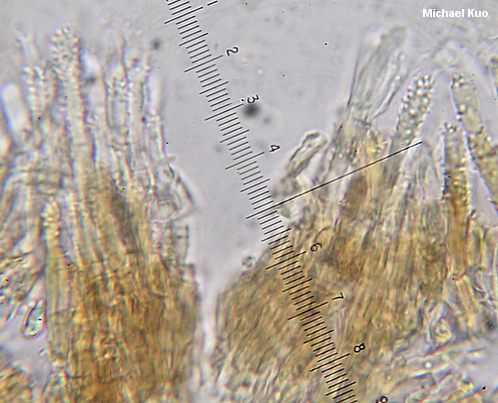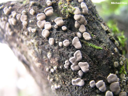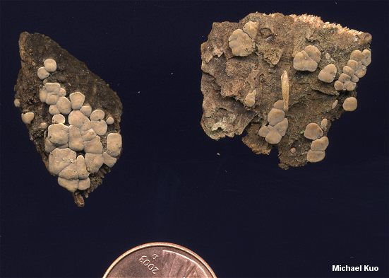 Xylobolus frustulatus [ Basidiomycetes > Russulales > Stereaceae > Xylobolus . . . ] by Michael Kuo Before the well-known cubist Fernand Léger discovered colors, his work must have looked like Xylobolus frustulatus--a fascinating crust fungus that looks like whitish tile fragments put together carefully with black grout. Xylobolus frustulatus is found on the dry, well-decayed wood of oaks in eastern North America, and in Texas and Mexico. Although it is fairly easily identified without microscopic examination it is worth taking a peek, if you have a microscope, at its funky "acanthohyphidia," which look like bottle brushes. Stereum frustulatum is a synonym. Description: Ecology: Saprobic on the dry, well decayed wood of oaks (and, rarely, other hardwoods); growing densely gregariously in patches of adjacent "frustules"; causing a white pocket rot; spring, summer, fall, and winter; fairly widely distributed in eastern North America, and in Texas and Mexico. Fruiting Body: Resupinate; growing in patches up to 2 feet (or more) across; individual frustules up to about 1 cm across, irregularly polygonal; surface smooth or minutely pimpled, whitish to grayish or brownish (or at maturity slightly pinkish or orangish); sides dark brown to black. Flesh: Hard; brownish. Spore Print: Pinkish to orangish. Microscopic Features: Spores 3.5-7 x 2.5-3.5 µ; smooth; elliptical; amyloid. Simple hyphidia, pseudoacanthohyphidia, and acanthohyphidia present. REFERENCES: (Persoon, 1801) Boidin, 1958. (Fries, 1821; Saccardo, 1888; Lincoff, 1992; Chamuris, 1988; Barron, 1999; Binion et al., 2008.) Herb. Kuo 10270404, 04010701. This site contains no information about the edibility or toxicity of mushrooms. |