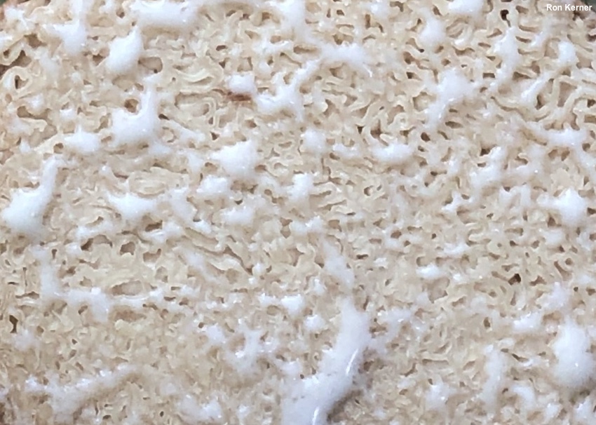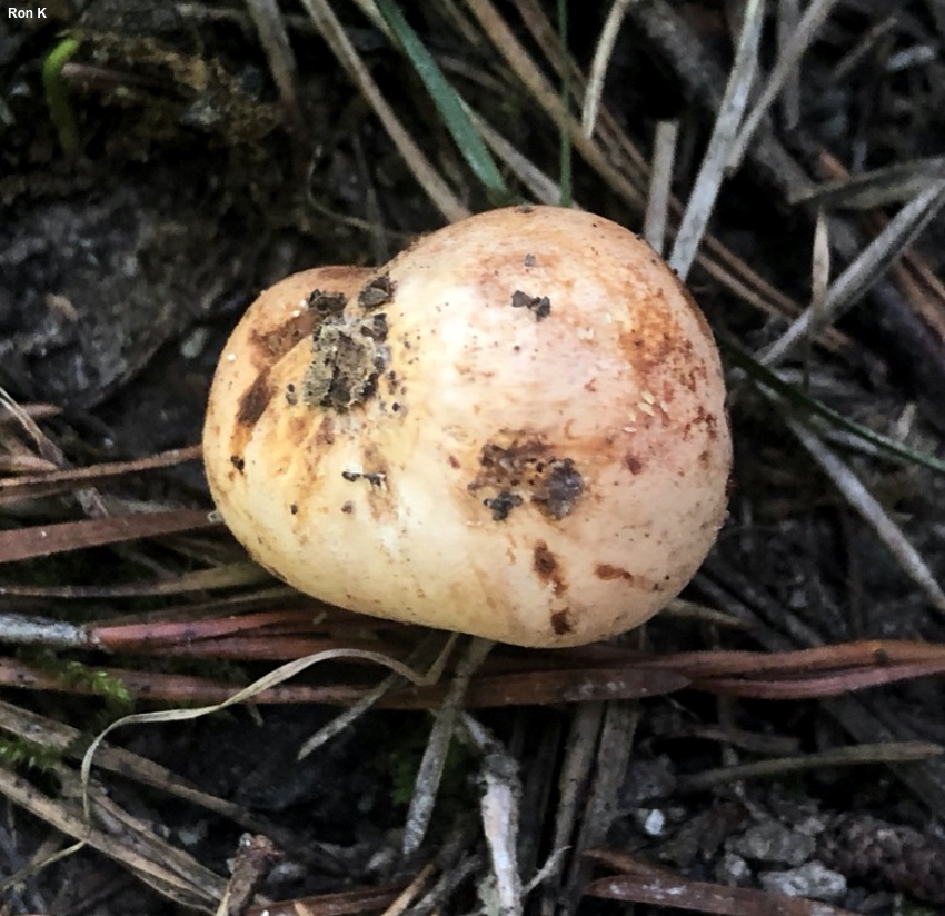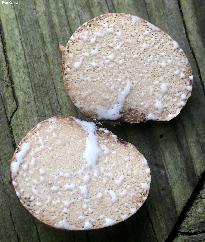 Zelleromyces cinnabarinus [ Basidiomycota > Russulales > Russulaceae > (Zelleromyces) Lactarius . . . ] by Michael Kuo Found under pines in the southern United States, Zelleromyces cinnabarinus looks like a puffball until you slice it open. It has a "loculate" interior, composed of tightly packed "locules"—the term in Mycologese for cavities formed by the spore-producing surfaces of truffles and false truffles. If you cook a bunch of spaghetti, pack it as tightly as possible into a balloon, freeze your masterpiece, and then slice it in half with the world's sharpest razor blade so that the individual spaghetti noodles get cross-sectioned, you will approximate "loculate." But with Zelleromyces cinnabarinus you will also be in for a surprise when you slice a young fruiting body open, because the mushroom will produce milk like a species of Lactarius—a "milky cap." And in fact this funky mushroom is a milky cap, or a "milky ball" (just move along); it represents a sequestrate form of Lactarius that does not produce a cap, stem, and gills. Thanks to Ron Kerner for documenting, collecting, and preserving Zelleromyces cinnabarinus for study; his collection is deposited in The Herbarium of Michael Kuo. Description: Ecology: Mycorrhizal with pines (species of Pinus, with bundled needles); growing along or gregariously; summer and fall; distributed from Mexico and Texas to the Carolinas, Illinois, and Indiana. The illustrated and described collection is from Indiana. Fruiting Body: 1–3 cm across; shaped more or less like a ball or a rounded cushion; sometimes fused with other fruiting bodies and appearing lobed; pinched at the base, sometimes (especially when young) attached to a tiny basal stub; outer surface bald or a little felty, dry, whitish to orangish at first, maturing to dull cinnamon orange or brownish orange; interior loculate (see above), packed more tightly toward the base, whitish when young, becoming orangish to brownish. Milk: White and abundant in young fruiting bodies; later more scant and watery; not staining tissues. Odor and Taste: Not distinctive. Spore Print: Not obtainable. Microscopic Features: Spores 10–14 µm (excluding ornamentation); globose to subglobose; ornamented with amyloid spines and ridges 0.5–1.5 µm high, forming a complete or nearly complete reticulum; ornamentation fine but dense. Basidia 1- and 2-sterigmate. Cystidia not found. Peridium surface a turf of hyphae 2–3 µm wide, smooth, hyaline; terminal cells cylindric to slightly fusiform or irregular. REFERENCES: R. Singer & A. H. Smith, 1960. (Sundberg & Trappe, 1975; Miller & Lebel, 1999; Trappe et al., 2007; Elliott & Stephenson, 2018.) Herb. Kuo 09181901. This site contains no information about the edibility or toxicity of mushrooms. |